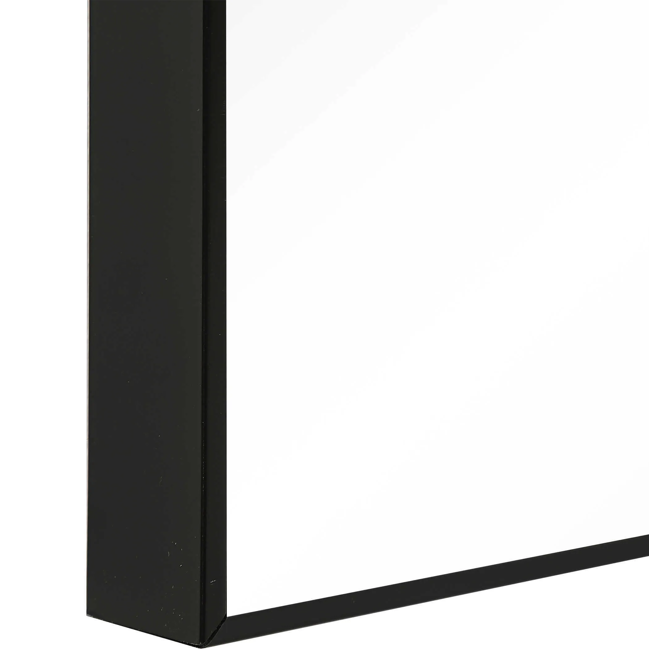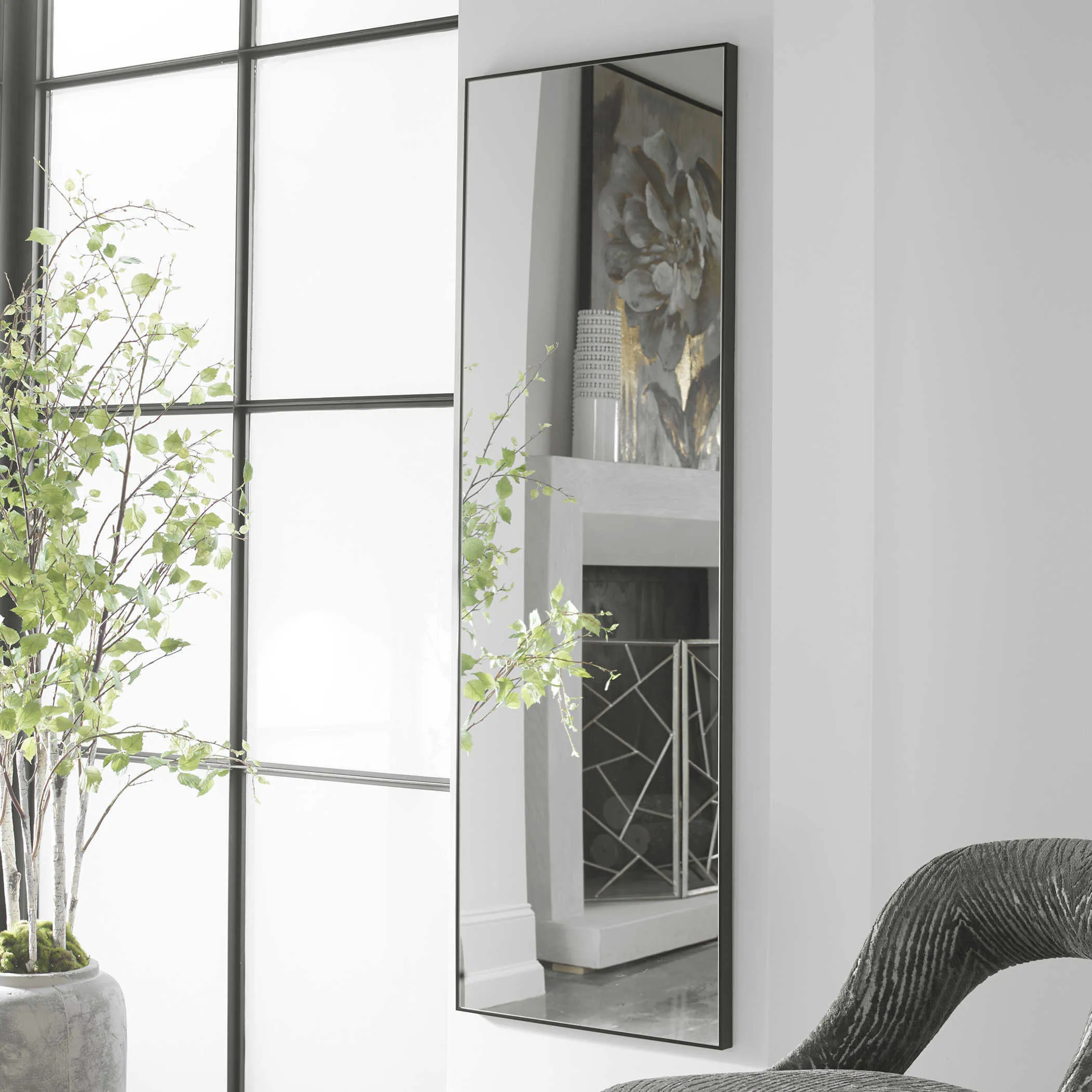 This thin black frame with plain mirror creates a simple, clean design that offers a contemporary look. May be hung either vertically or horizontally.