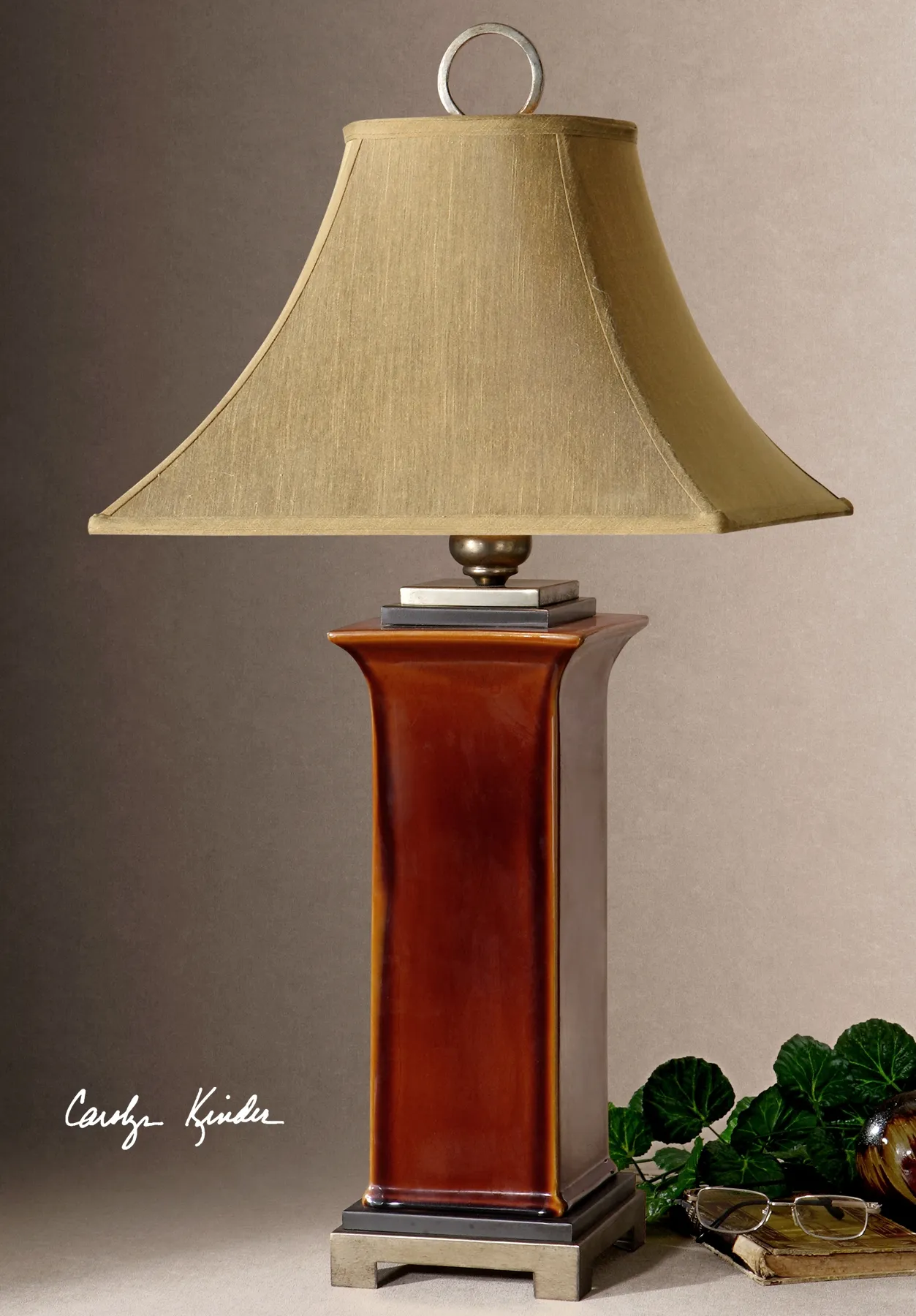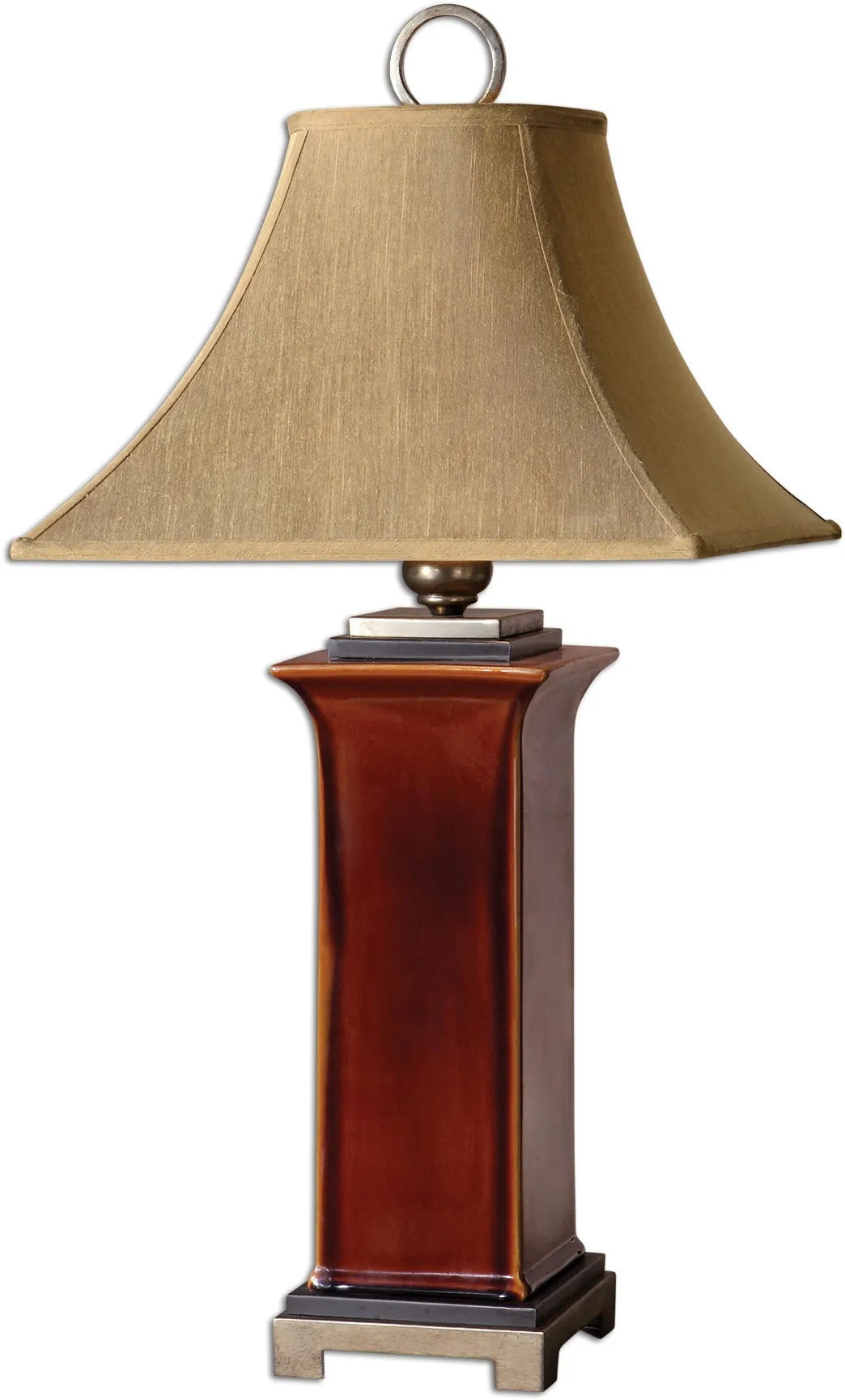 Ceramic base finished in a glossy, burnt russet glaze with dark bronze accents and antiqued silver champagne details. The round top, square bottom, bell shade is a golden bronze linen fabric with natural slubbing.