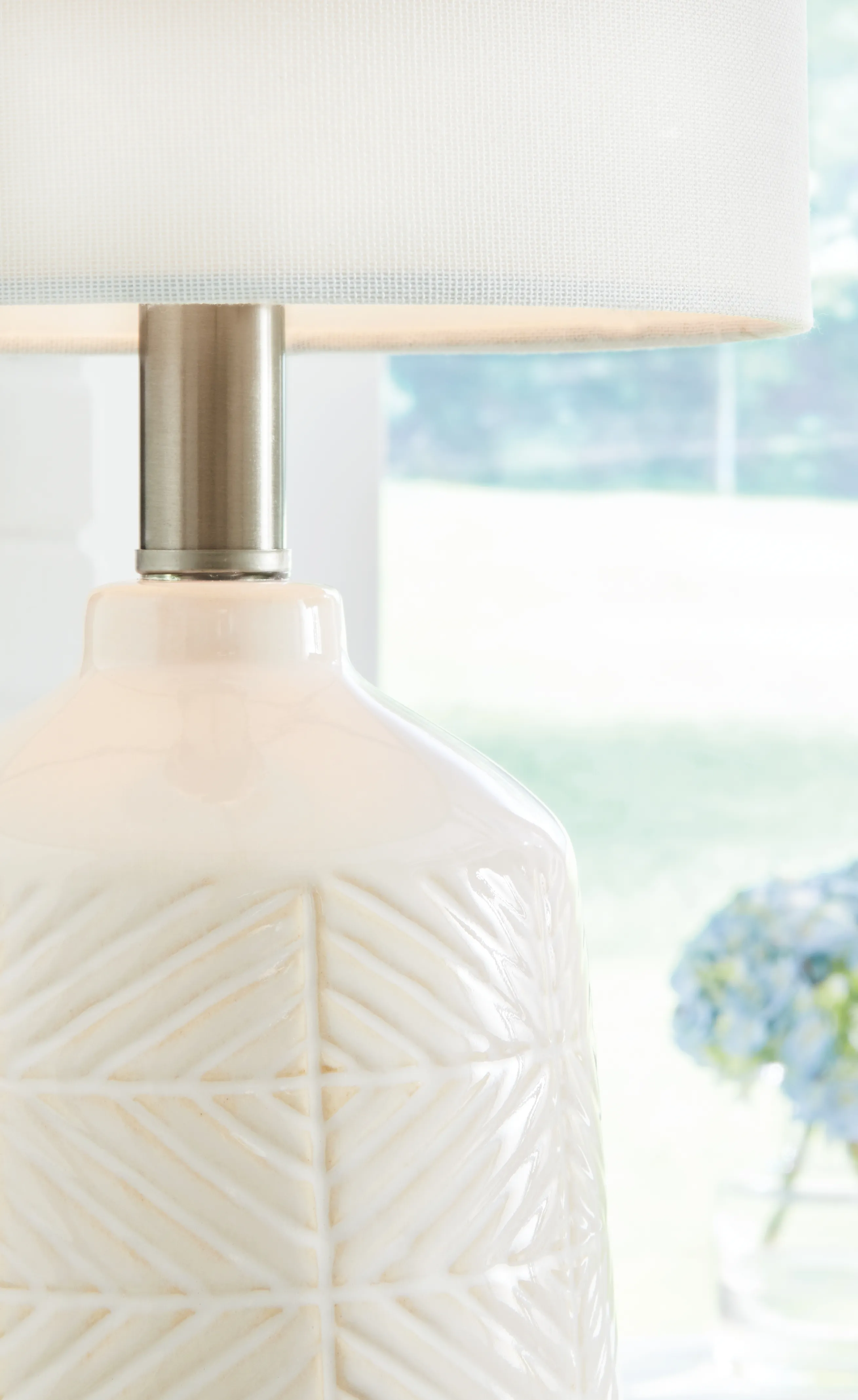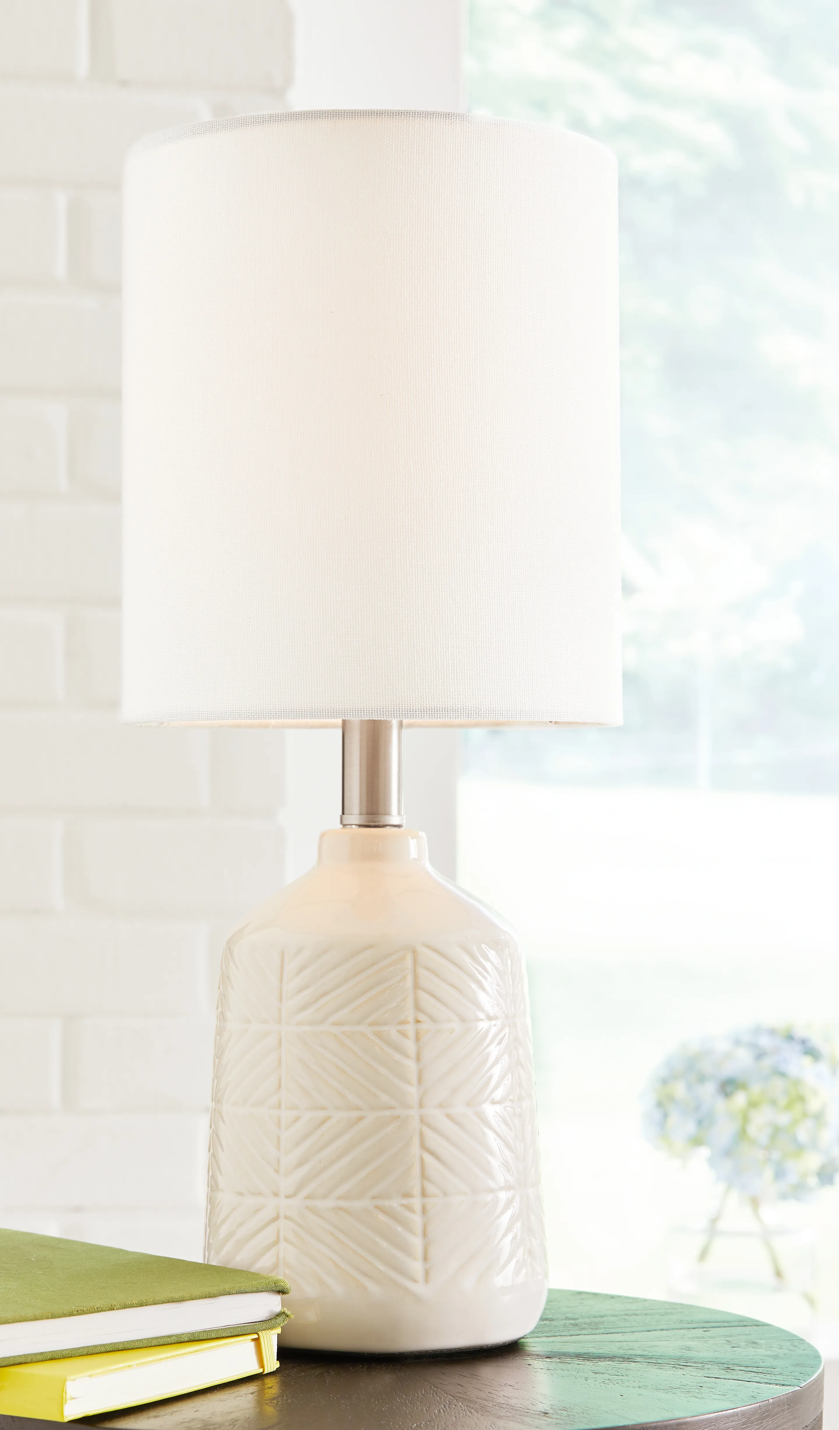 An intriguing sculptural design with a simply chic allure, this white glazed ceramic table lamp is a fresh take on vintage casual style. A fabric drum shade lends a transitional vibe to any interior style.