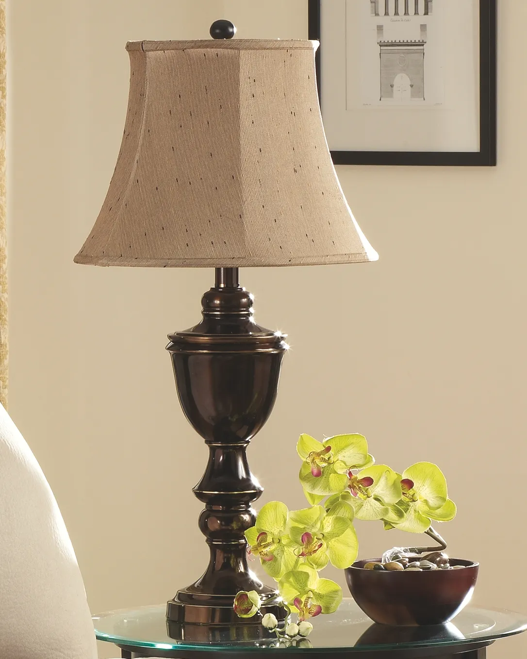 Eye-catching curves ahead. Metal table lamp showcases an exquisitely turned base and elegant bell shade. The rich finish and textured champagne shade offer a sophisticated look.