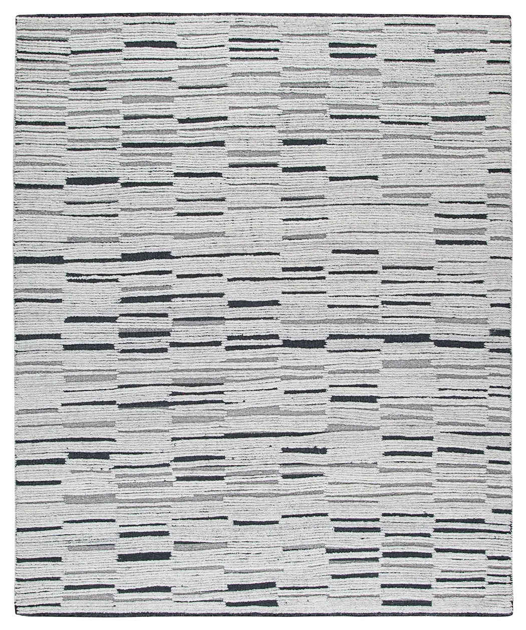 This modern handwoven area rug features a sophisticated abstract black and cream stripe design. Contrasting colors and a bold block design make this piece the perfect accent accessory, whether your home is in the busy city or countryside.