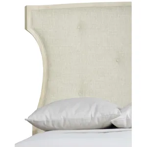 Wood-framed headboard with slightly curved ends with inset upholstered panel with button-tufting and welt