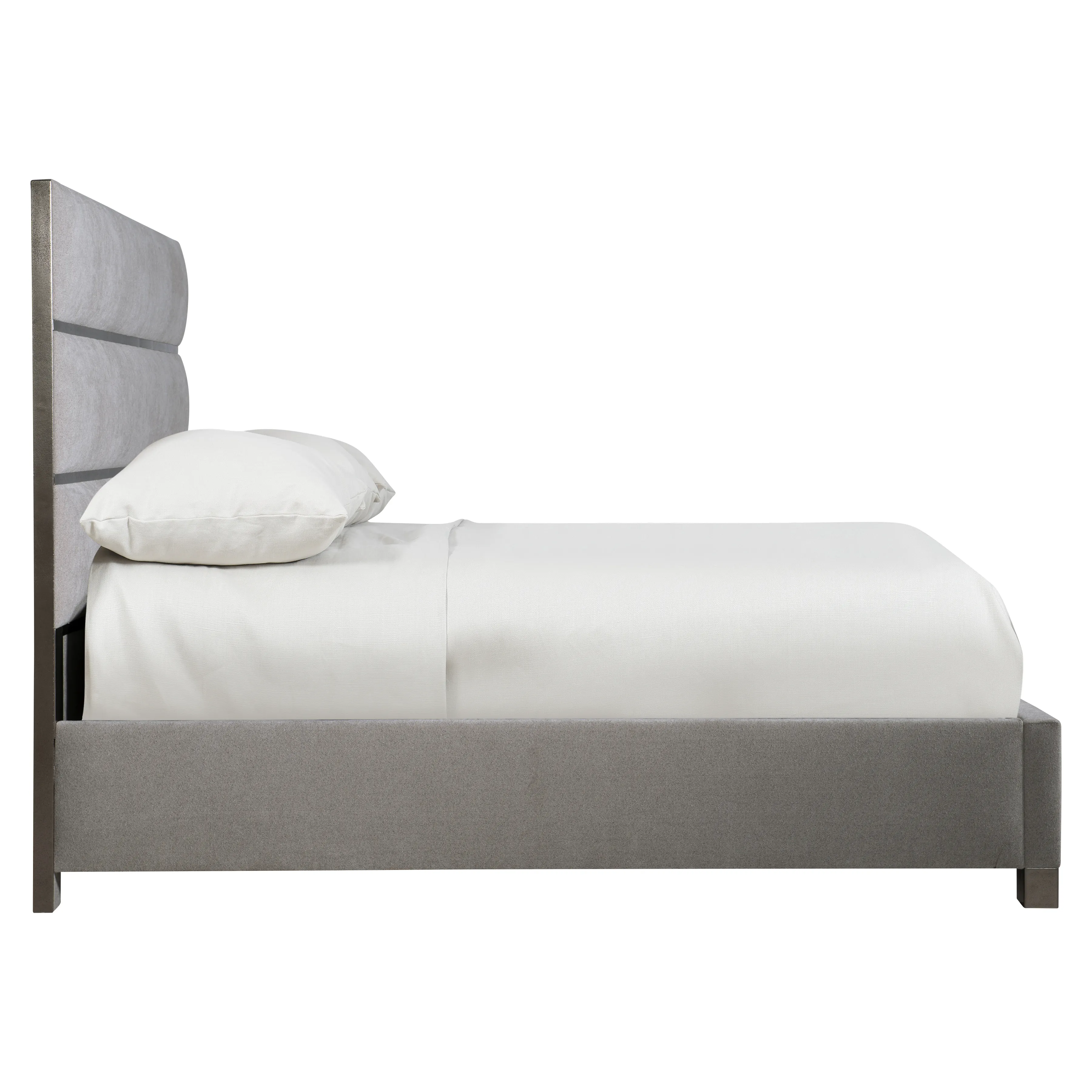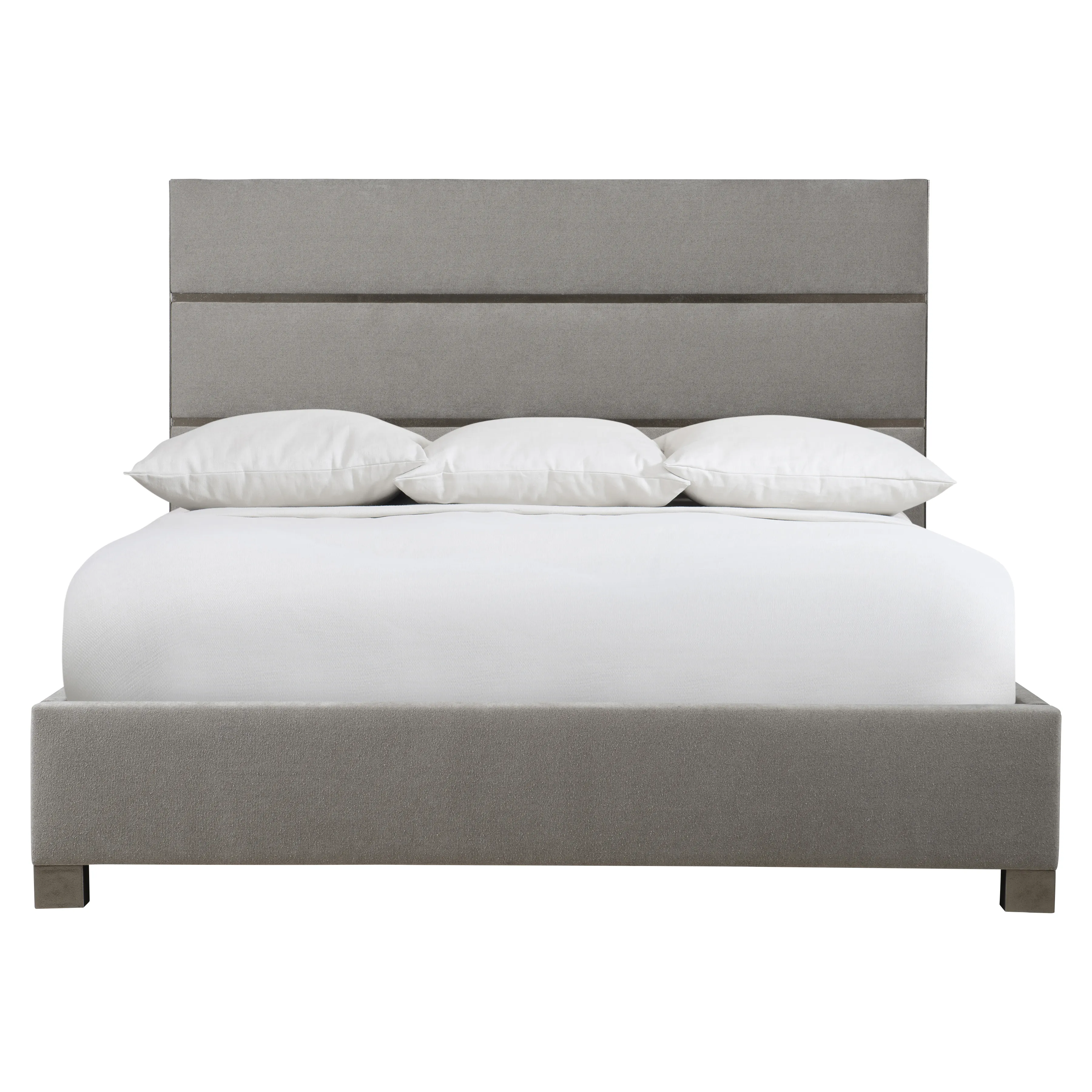 The luxurious and elegant Tinsley panel bed creates a winning combination of plush fabric and subtle metal. A panel headboard offers a cast aluminum frame and overlays in a graphite finish. The top upholstered panel wraps over the top of the headboard for a chic detail. Available in king size only.