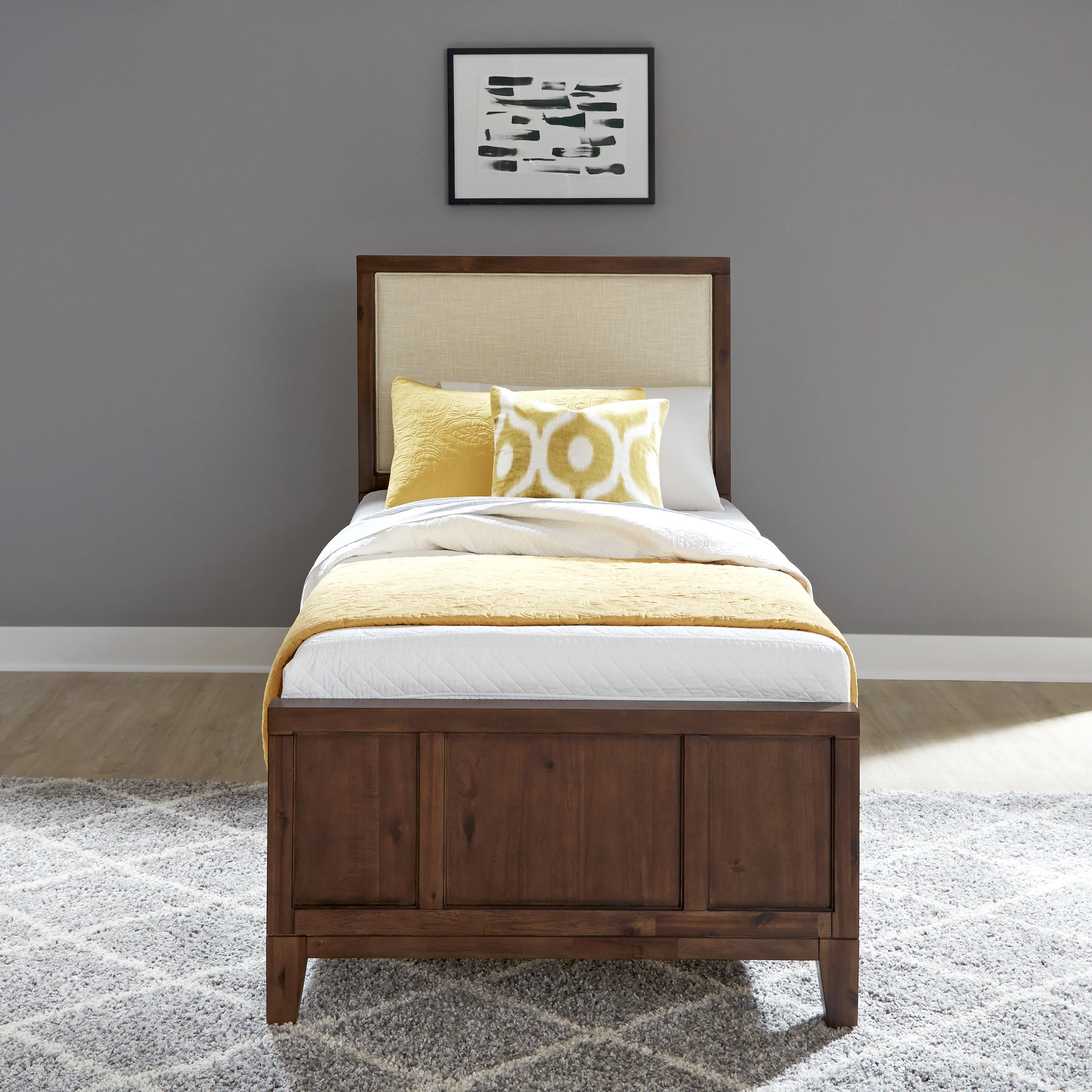 Updated mid-century modern design, fashioned from the west coast architectural design of the small subdivision homes of that era, known as bungalows. Crafted from Acacia wood solids and veneers over engineered woods, finished in a classic mid-century modern medium brown tone. Headboard features a center padded upholstered panel, covered in a woven blended natural colored linen and polyester fabric. Footboard features tapered raised legs, with matching veneer wood grain panels. Wood side rails with bed support slats complete the bed. Arrives to your door by parcel delivery service. Note finish and measurements may vary, assembly required. W-40 ½", D-81 ½", H-52"