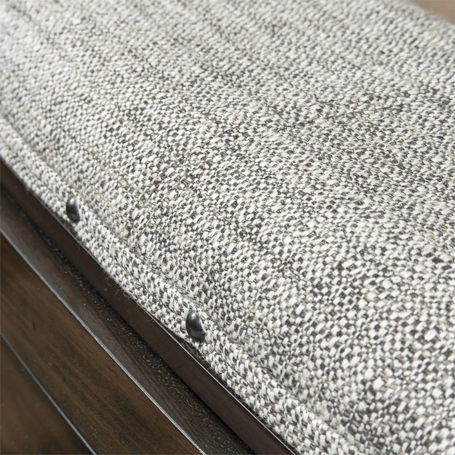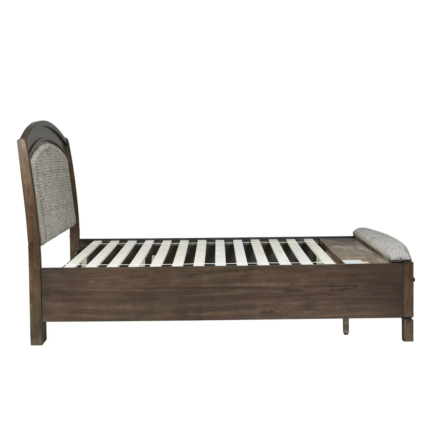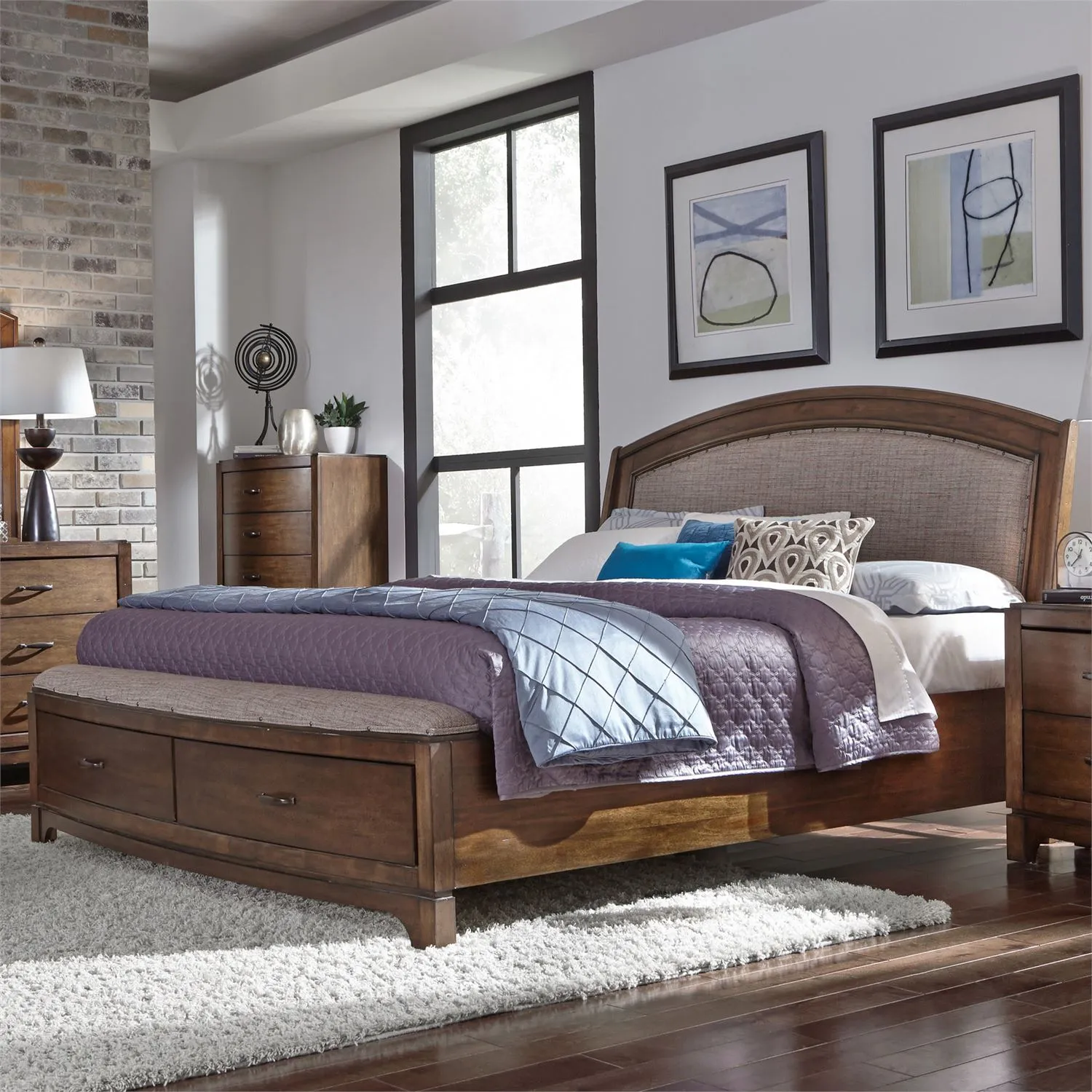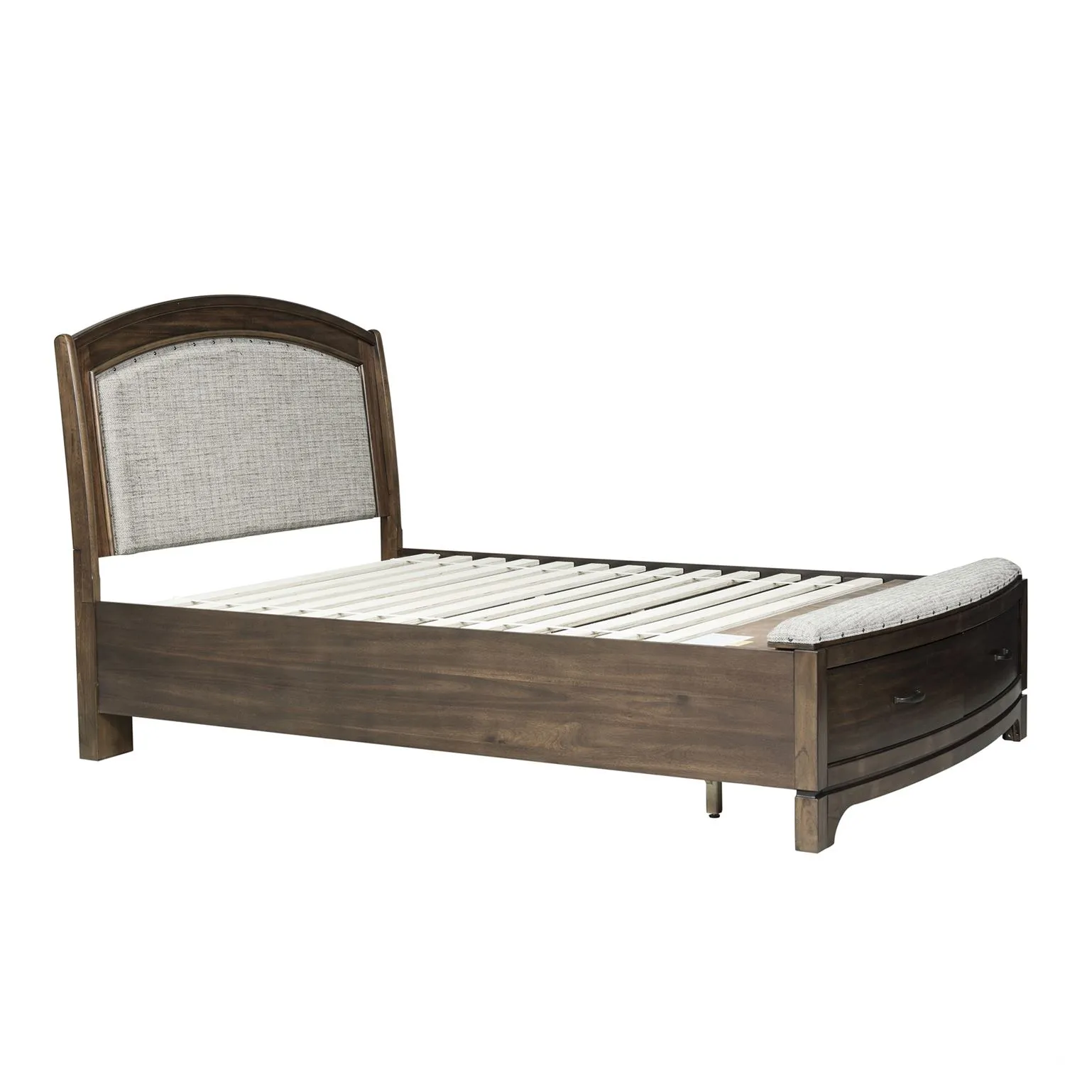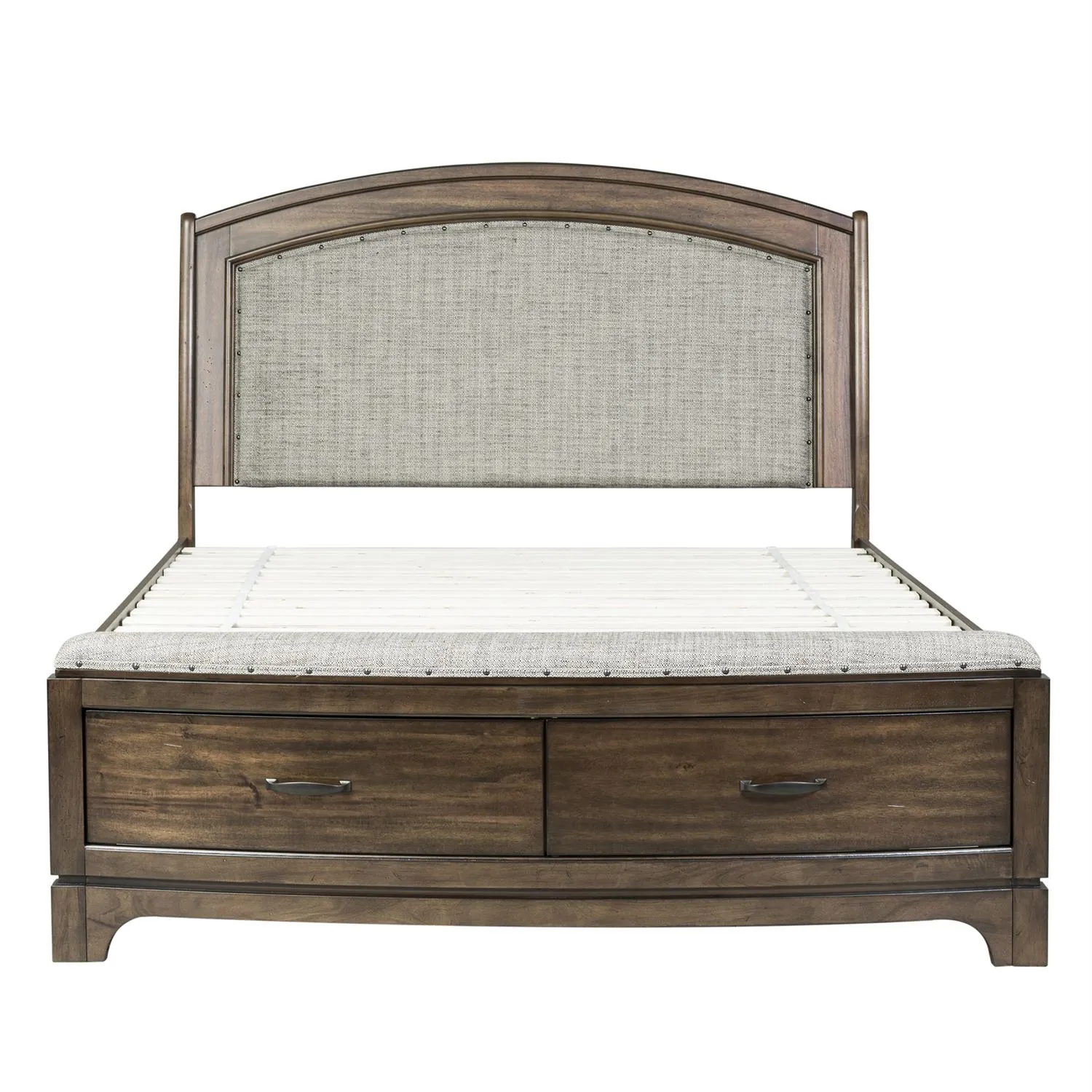 Make the most of your space with the contemporary style Avalon panel storage bed. The pebble brown finish is accented by black and tan tweed upholstery on the sleigh headboard and storage footboard. Bead molding, nail head trim, and the step top on the footboard add an edgy look. Store clothing or blankets in the full extension drawers located in the footboard equipped with dust proofing to protect your belongings and antique pewter hardware to make for easy opening.