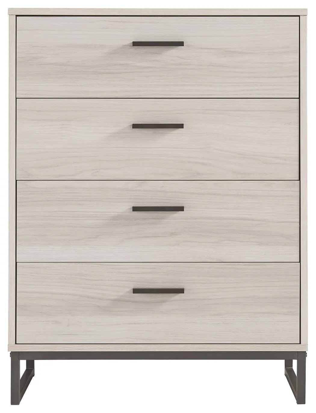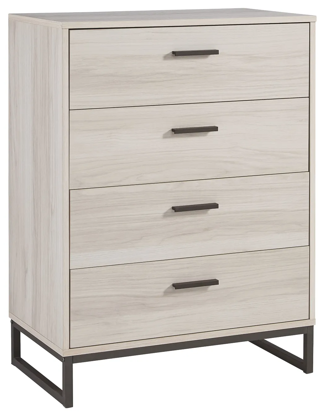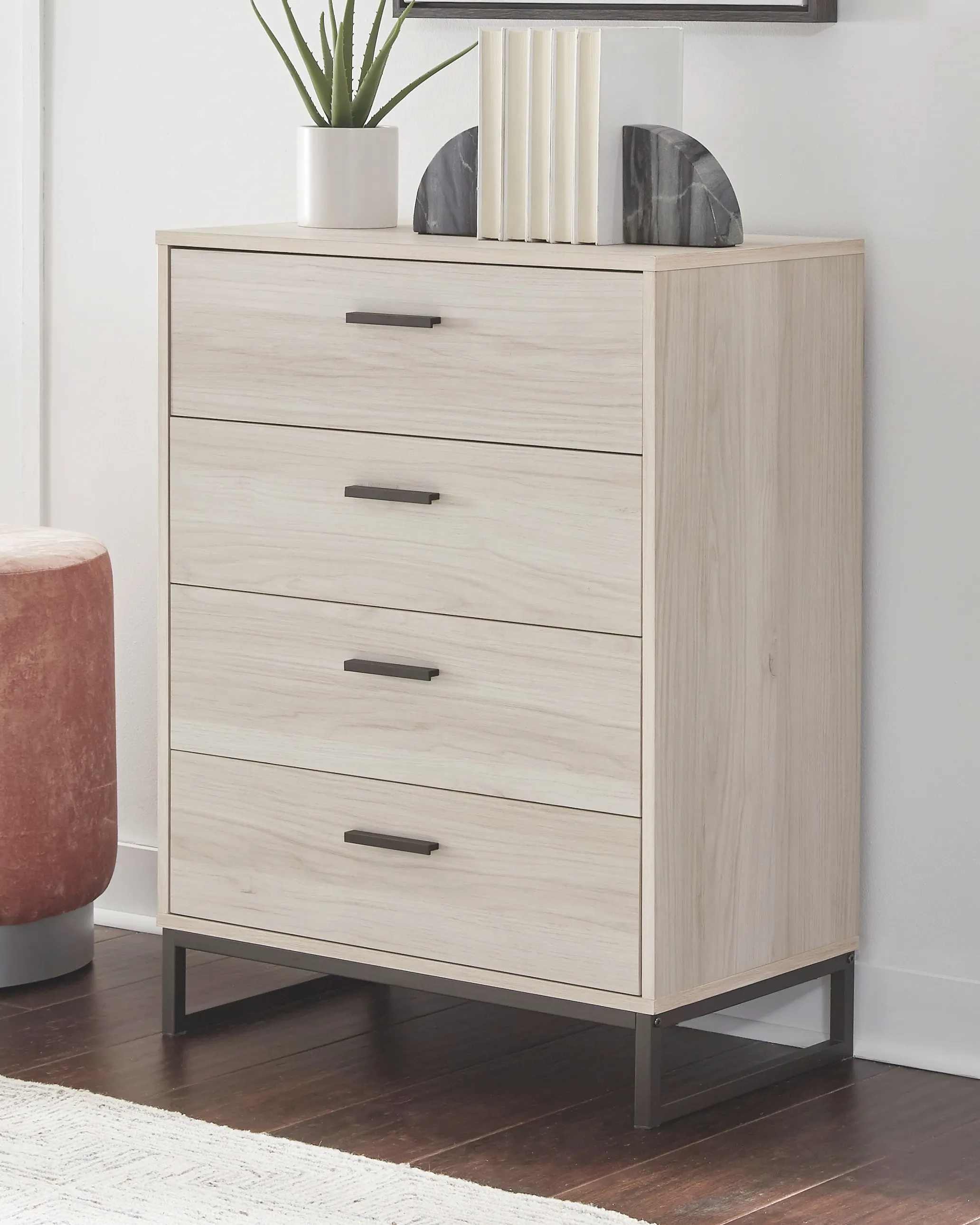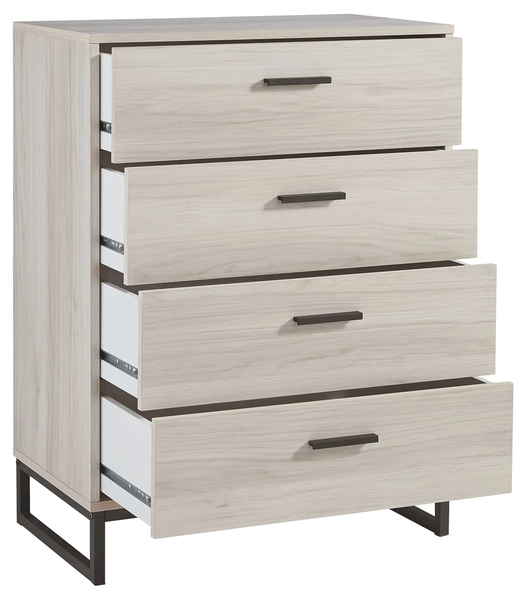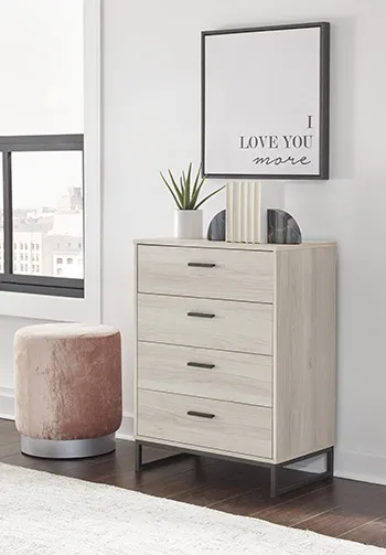 Light and bright, this four-drawer chest is inspired by chic design. A natural finish over replicated oak grain offers an authentic touch to this so-cool piece. Beautifully blend the hues of natural living with the edginess of your modern lifestyle.