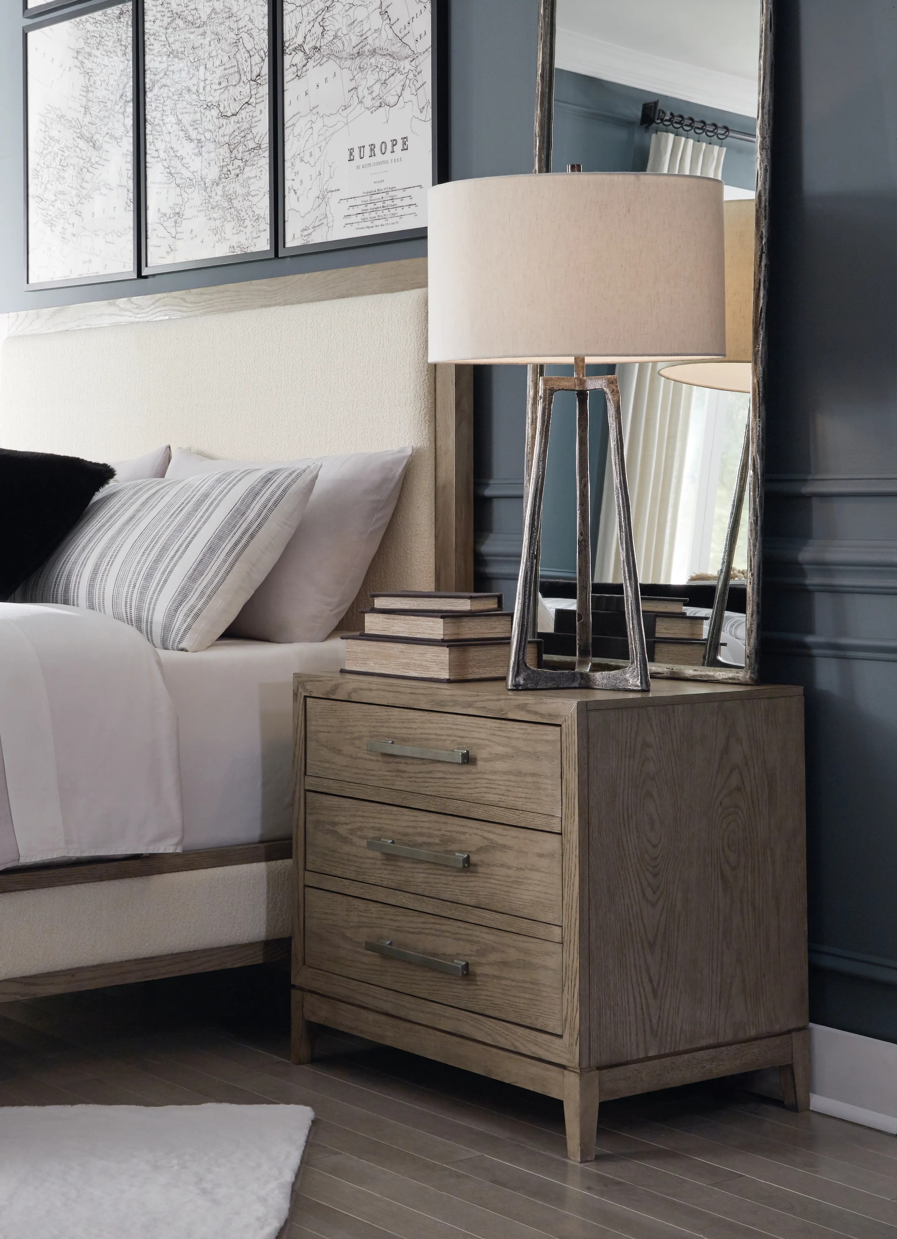 You want your room to reflect your refined sensibilities while remaining forward-thinking in design. The simple silhouette of this nightstand opens the door to a bedroom with the curated look and subtle flair you desire. Striking metal bar pulls in a light pewter tone are functionally fashionable against the piece's elegant waxy gray finish. Dual USB and AC outlets keep your electronics charged up and close at hand.