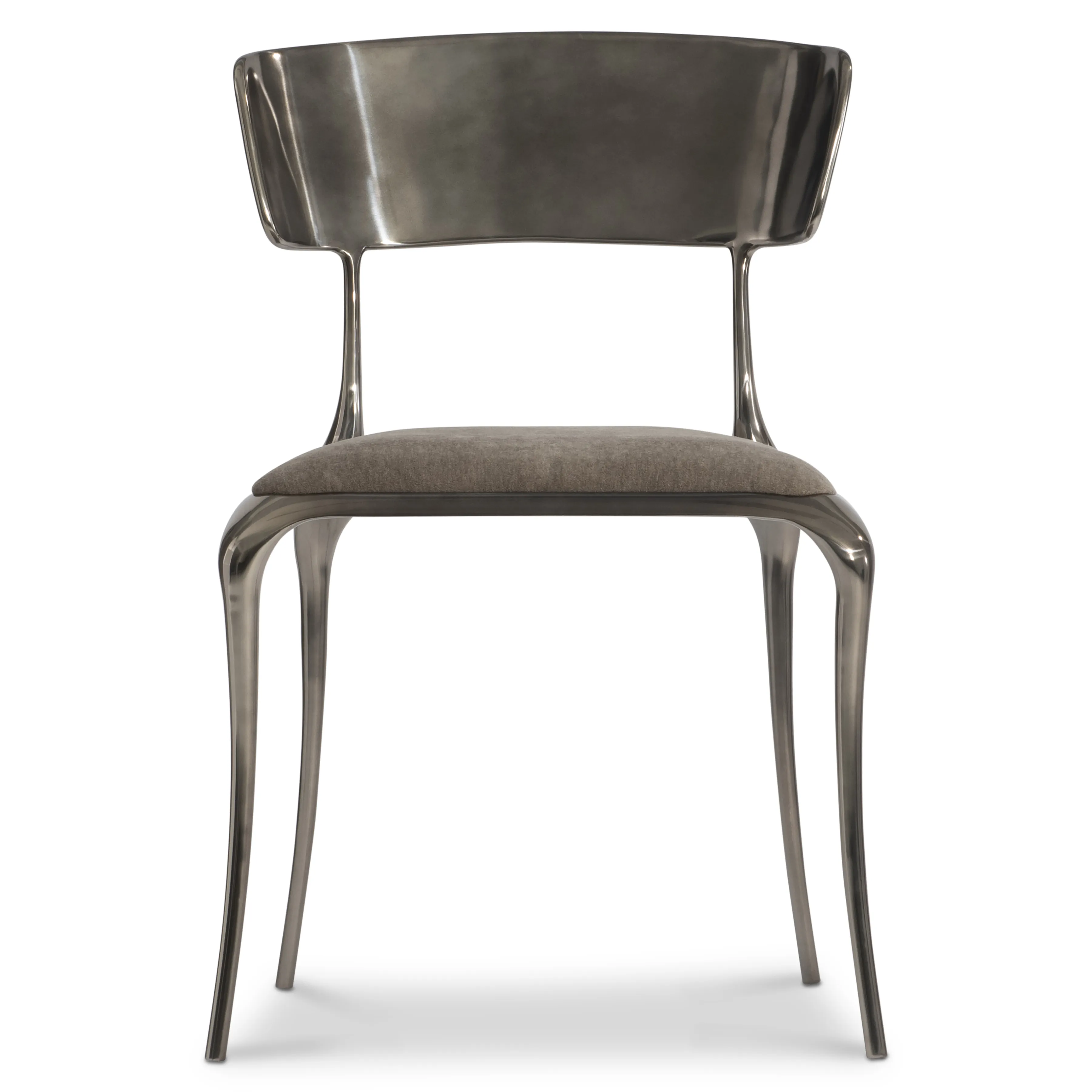 The classic Klismos design gets a sleek, modern update in the Pravo side chair. A curvaceous profile flows in a warm bronzed metal with a rounded back and shapely legs. Comfort is also provided with an upholstered seat.