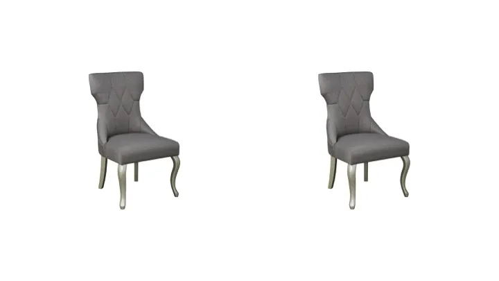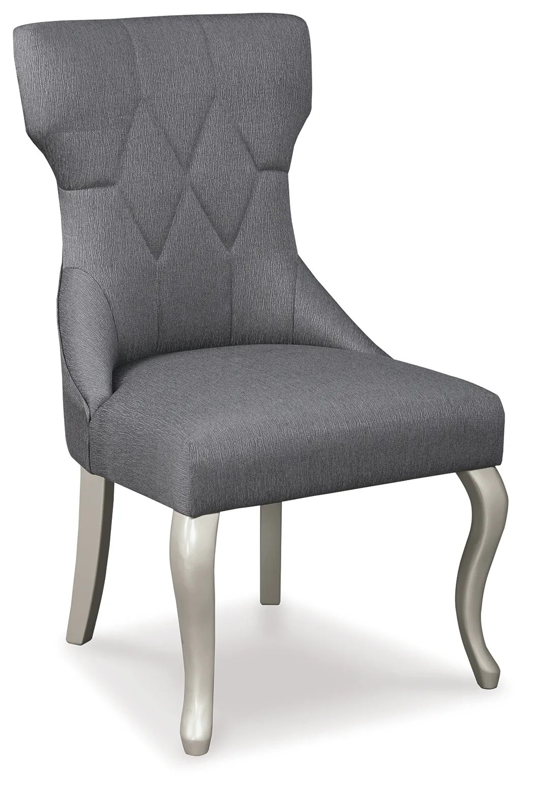 This dining room chair allures with the glitz and glam befitting silver screen queens. Showing off with a high-back design and hourglass figure, this upholstered chair wows with dramatic diamond tufting and classic cabriole legs in a lightly metallic finish.