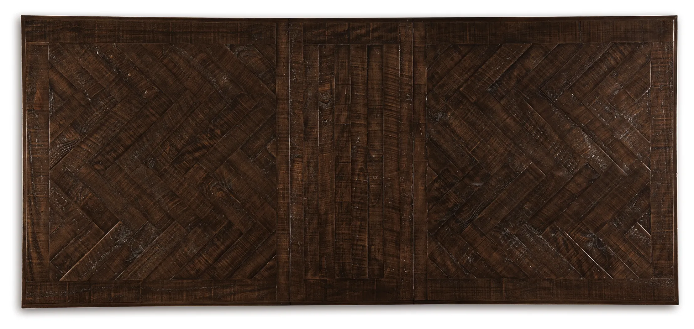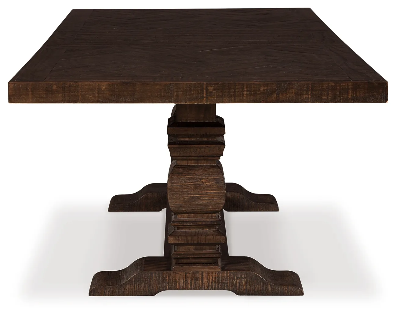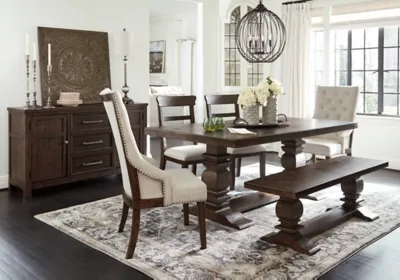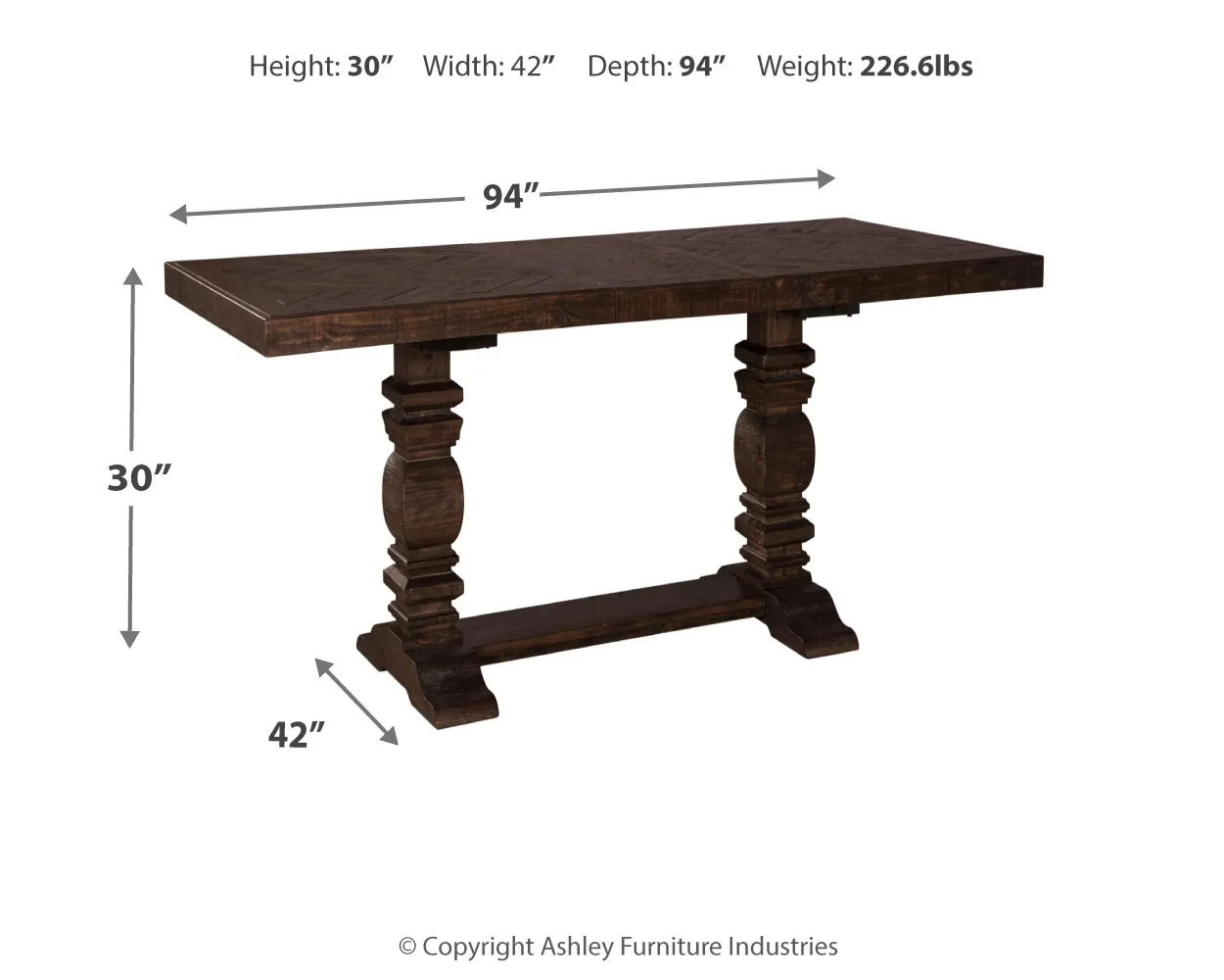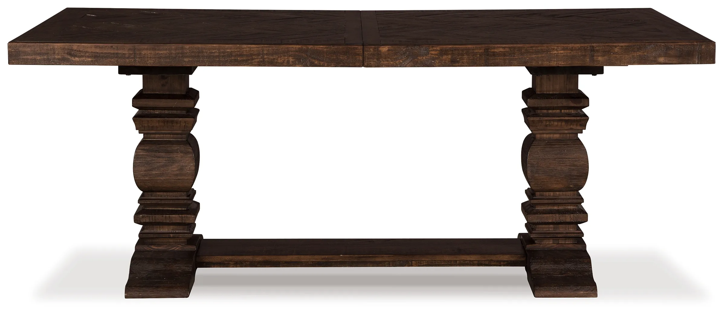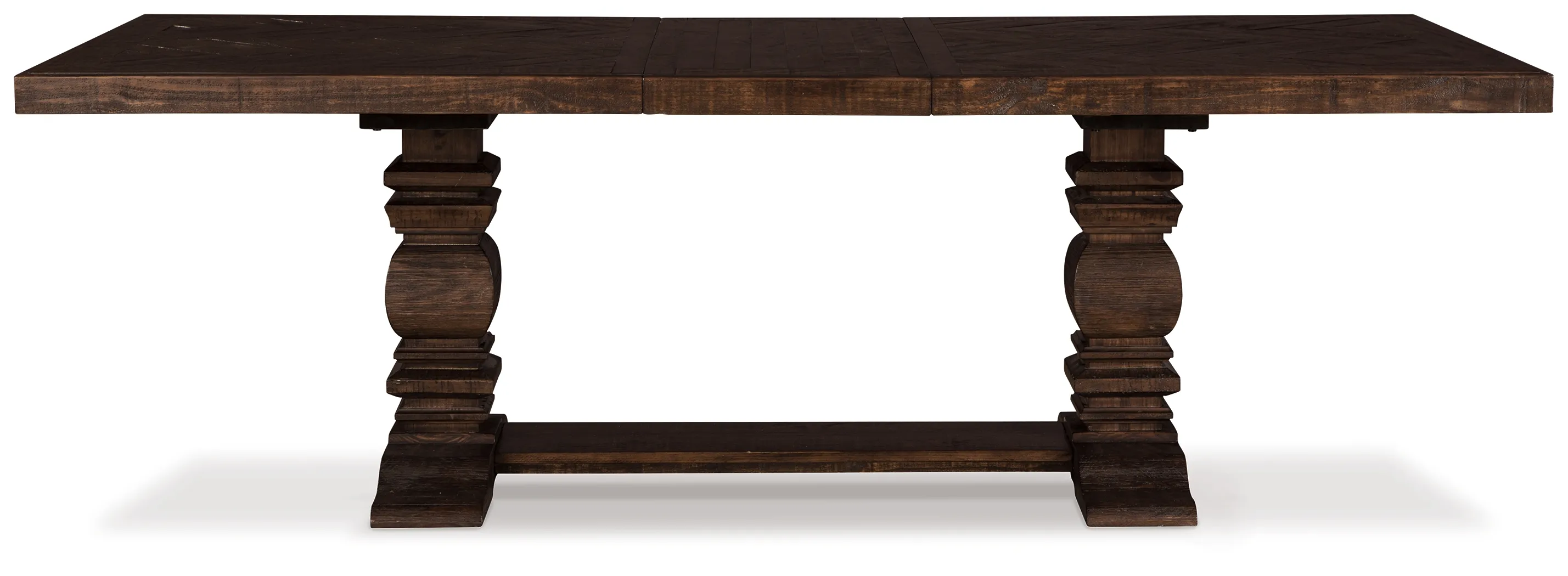 With its sturdy silhouette and lively, dark brown distressed finish, this dining room extension table gives modern farmhouse styling a rich, substantial sensibility. Double pedestal base with stretcher is an inspired choice for a hearty, homey aesthetic. Drop-in leaf makes it easy to accommodate drop-in guests.