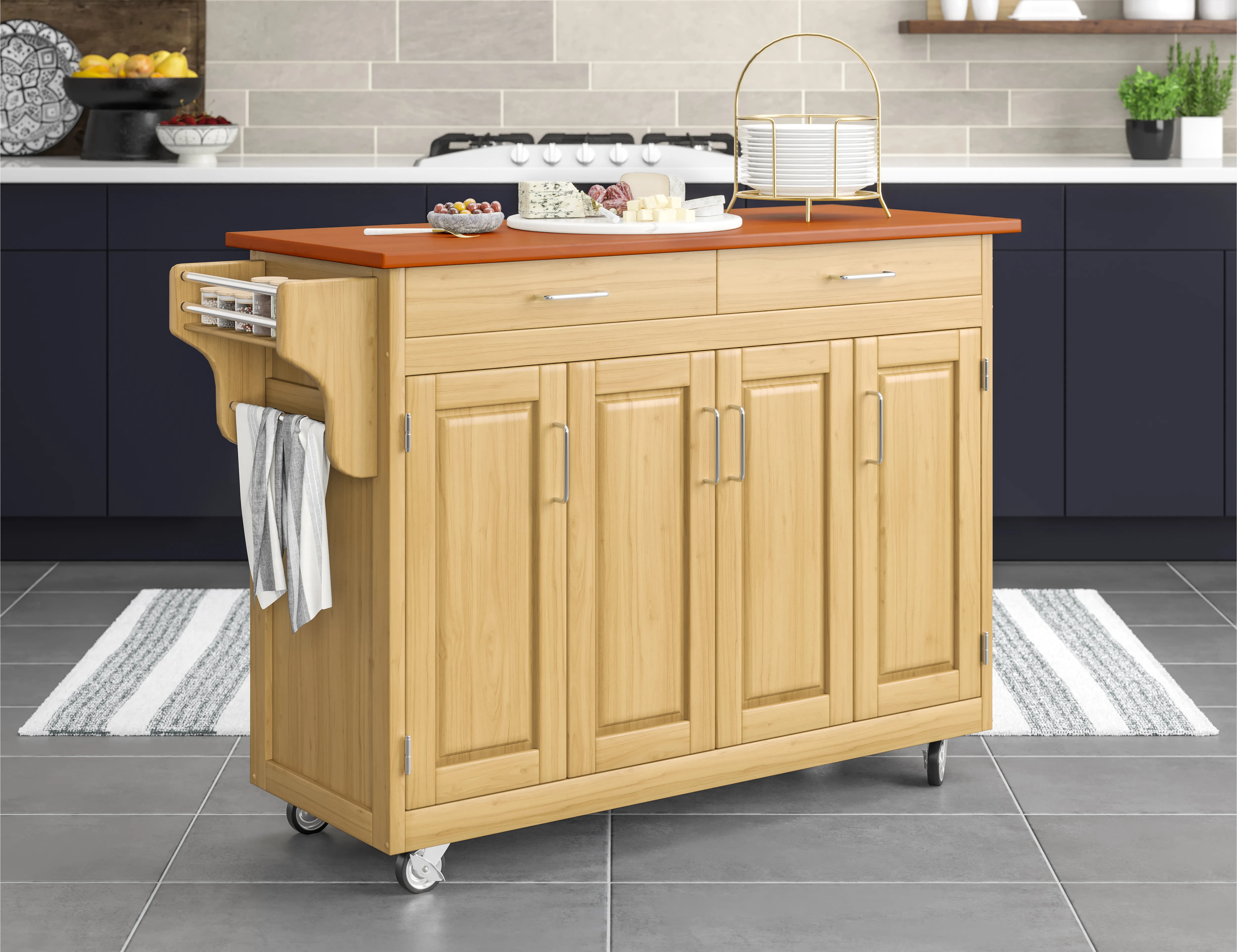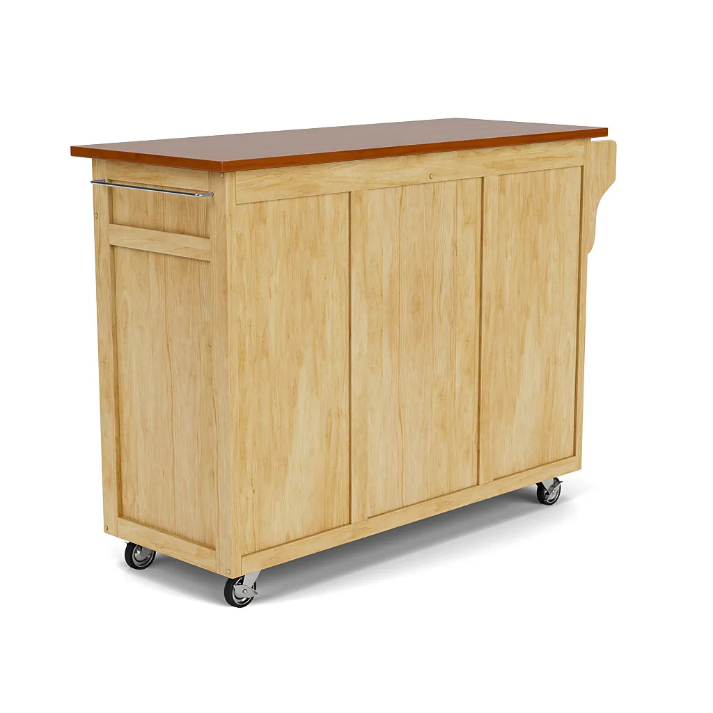 Create cabinet and counter space in an instant with the large Create-A-Cart Kitchen Cart by homestyles. This portable kitchen cart is constructed of solid sustainable hardwood with a durable veneer back and drawers. It has a beautiful natural wood finish with a non-toxic clear-coat and a solid wood top with oak finish. Features three large storage cabinets behind four paneled doors, each with adjustable shelving and stainless steel handles. Two spacious drawers fitted with easy-glide metal rails for soft opening and closing. Built-in spice rack, stainless steel towel bar and paper towel holder. Cart is mounted on industrial-strength casters (two locking). Comes carefully packaged with all items labeled and easy-to-follow assembly directions.