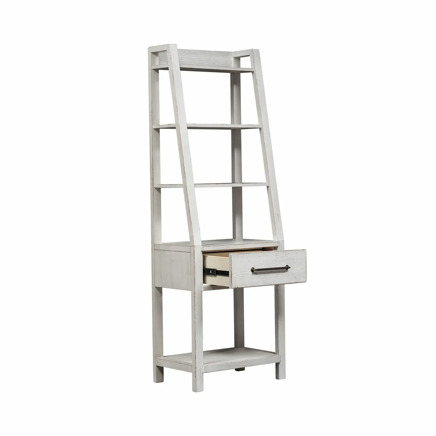 Maximize storage and convenience with the Modern Farmhouse 72" leaning bookcase. Crafted with poplar solids with knotty white oak veneers, this piece features a flea market white finish with heavy distressing, a fully stained full extension storage drawer, and lots of shelf space. This piece is available in an alternate finish, sure to be a great addition to any home. Users have the option to pair with the credenza, or use as a single bookshelf, as this piece can stand alone.