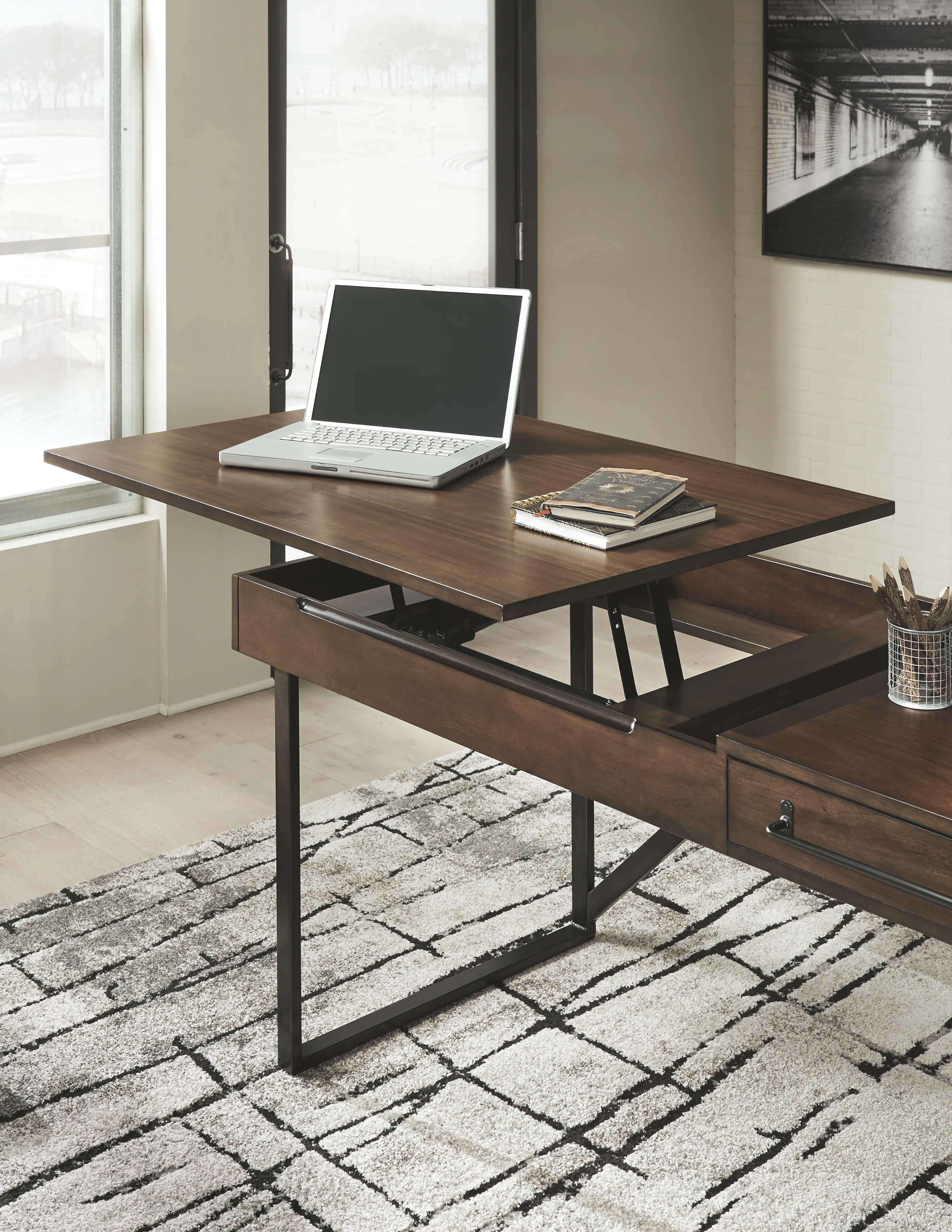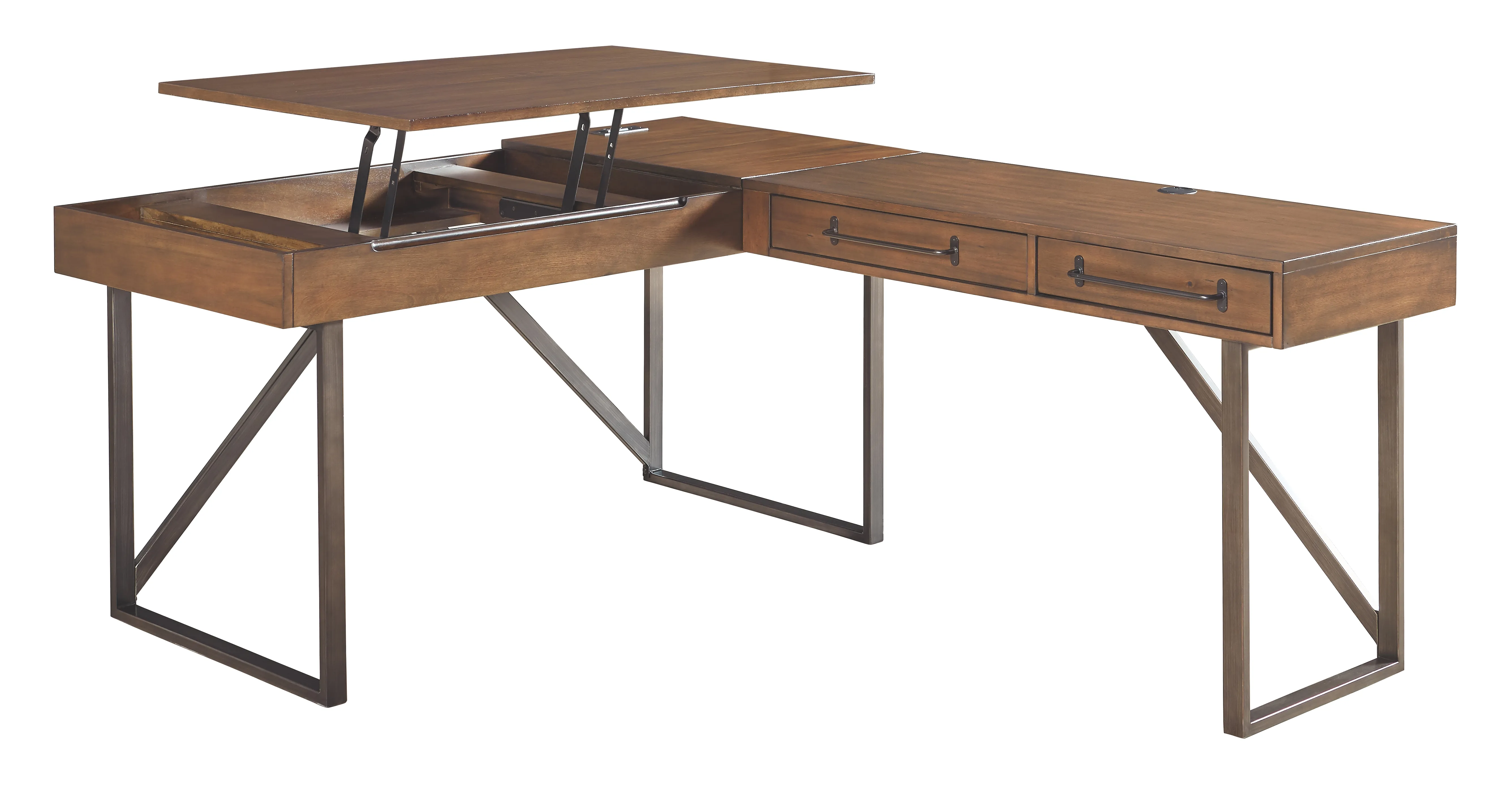 For fans of urban industrial design, this lift top desk and return set steals the show. Top is crafted with a mix of acacia veneer and engineered wood beautified with an oiled walnut-tone finish. Spring lift top raises the surface to a comfortable standing position, for a healthy alternative. Built for looks and productivity, the built-in power supplies and dual USB ports keep your devices close at hand and ready to go.