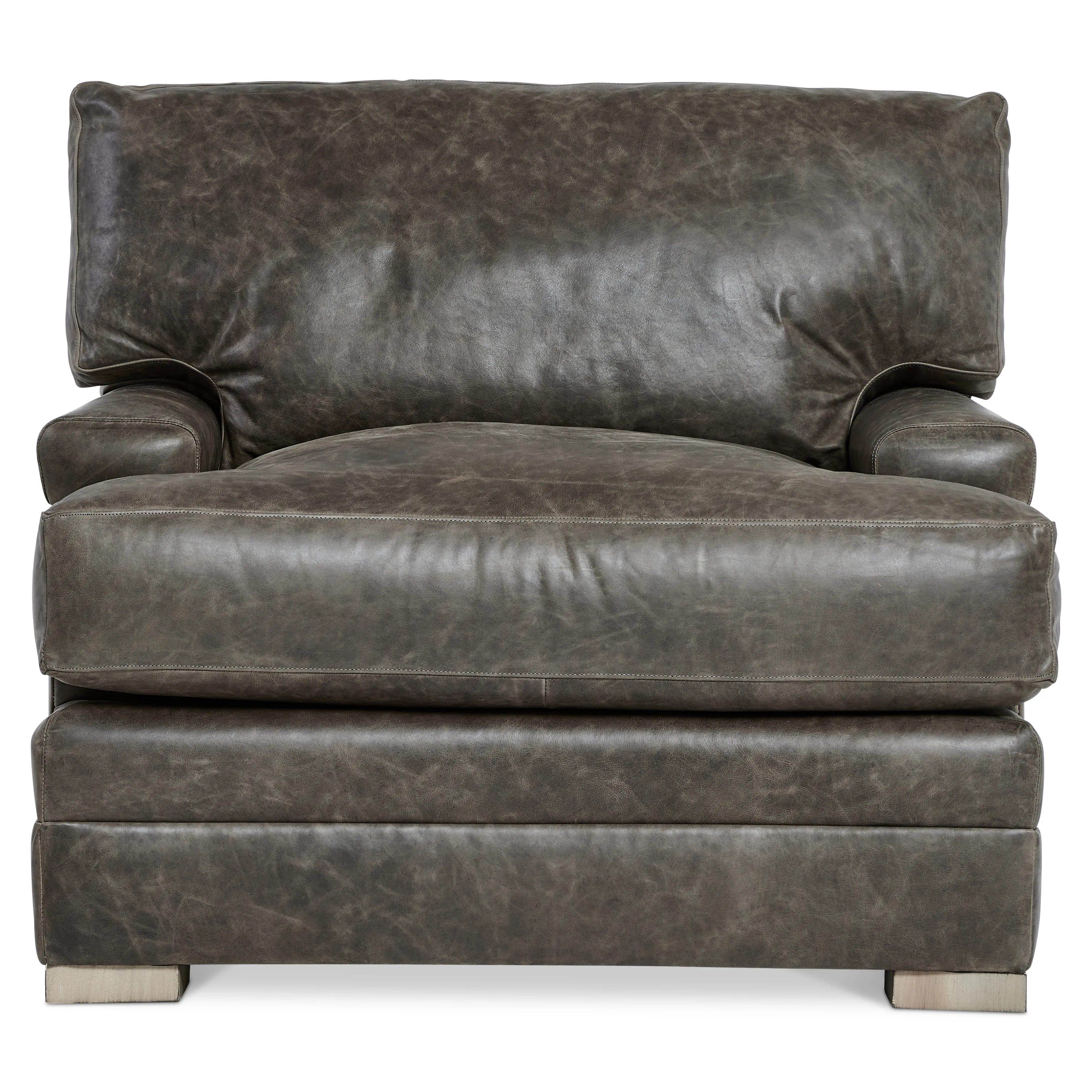 The lush leather seating on the Burnham chair takes a tailored approach, with stitching on the sides and back offering distinctive detailing. A deep seat cushion and box-stitched back pillow offer incredible comfort.