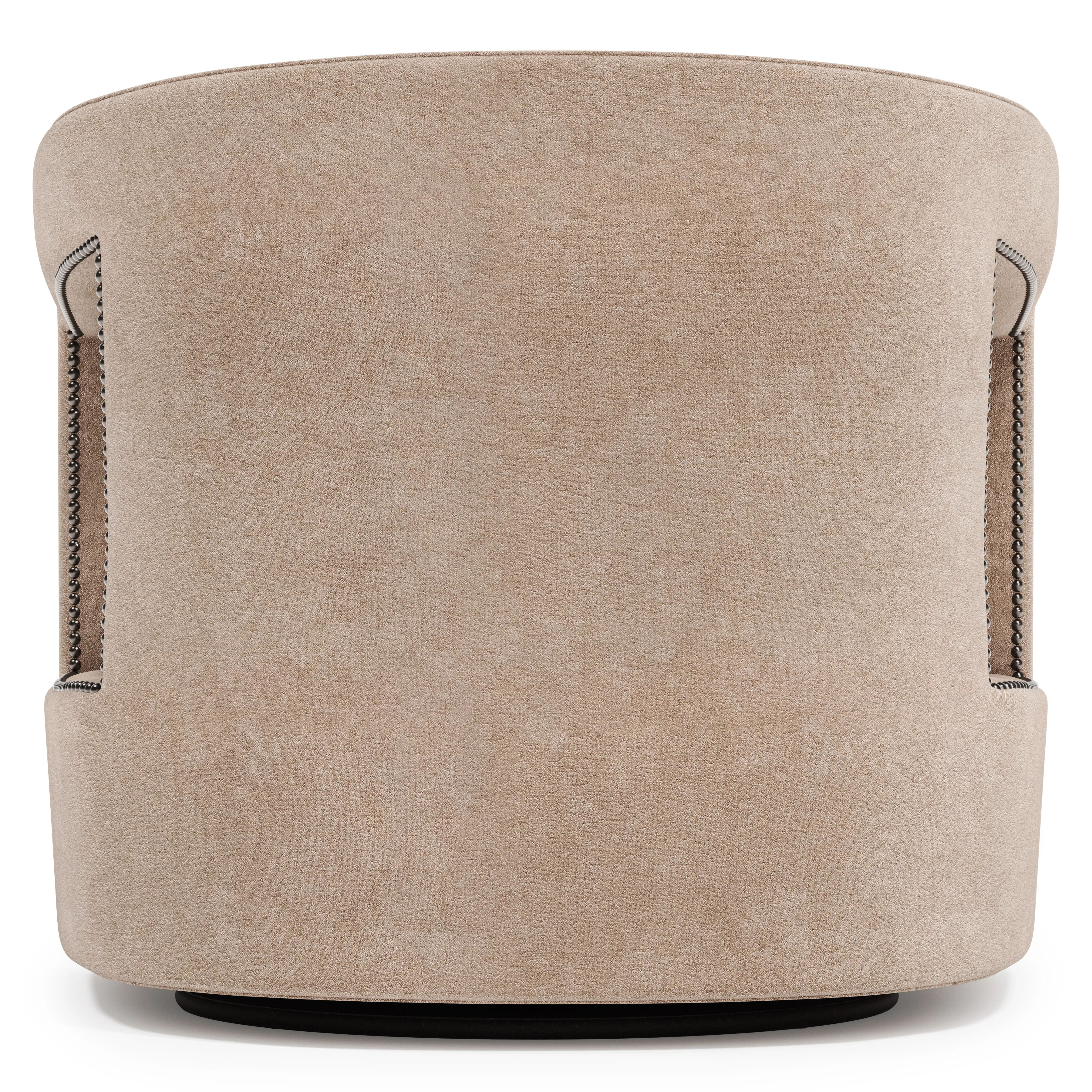 The sleek, sculptural design of the Alana swivel chair adds modern flair to an interior, blending seamlessly with contemporary and transitional styles. Two cutouts on either side offer a crisp, polished look. Webbing construction and spring down cushioning provide luxurious comfort and support.