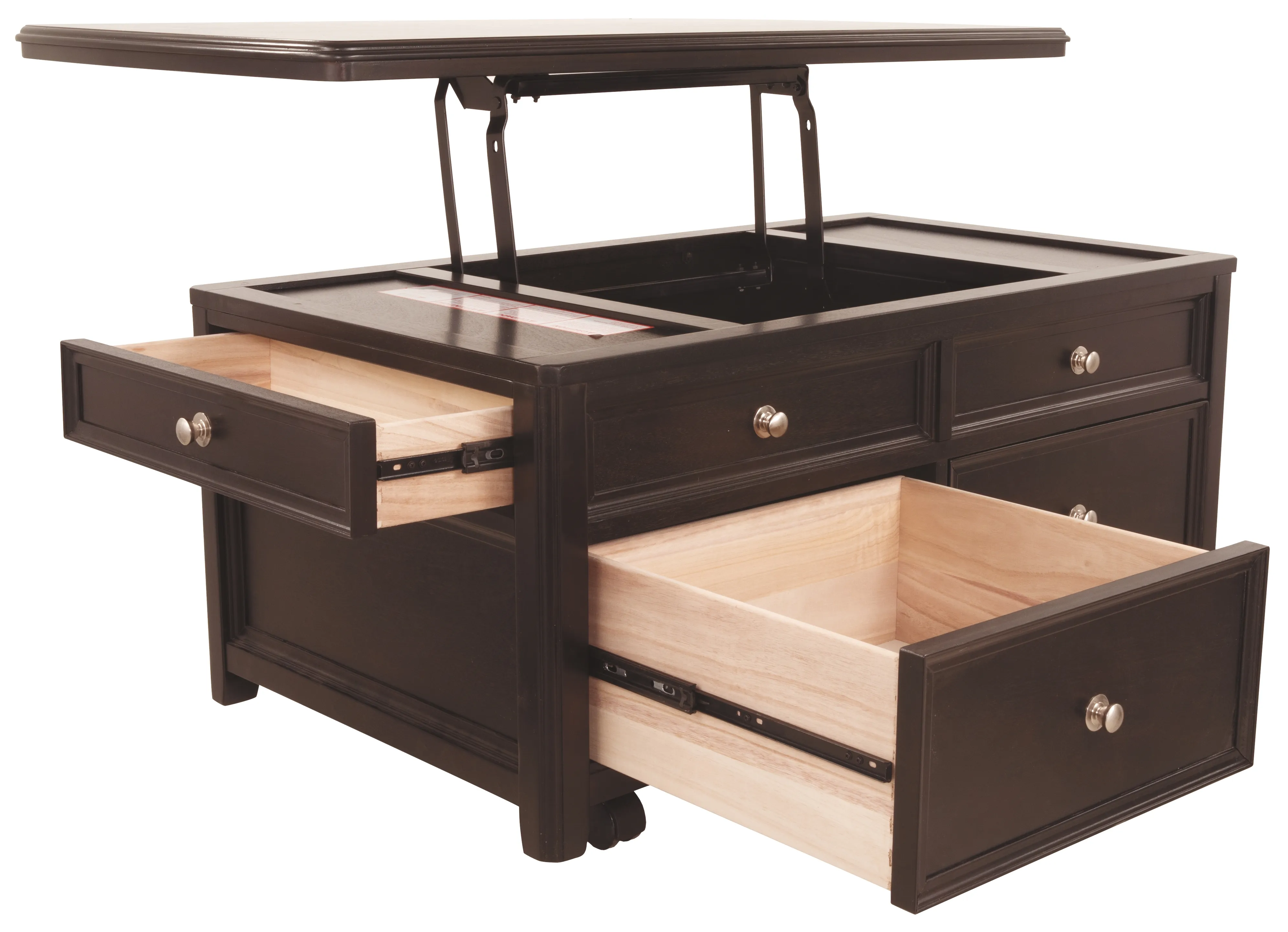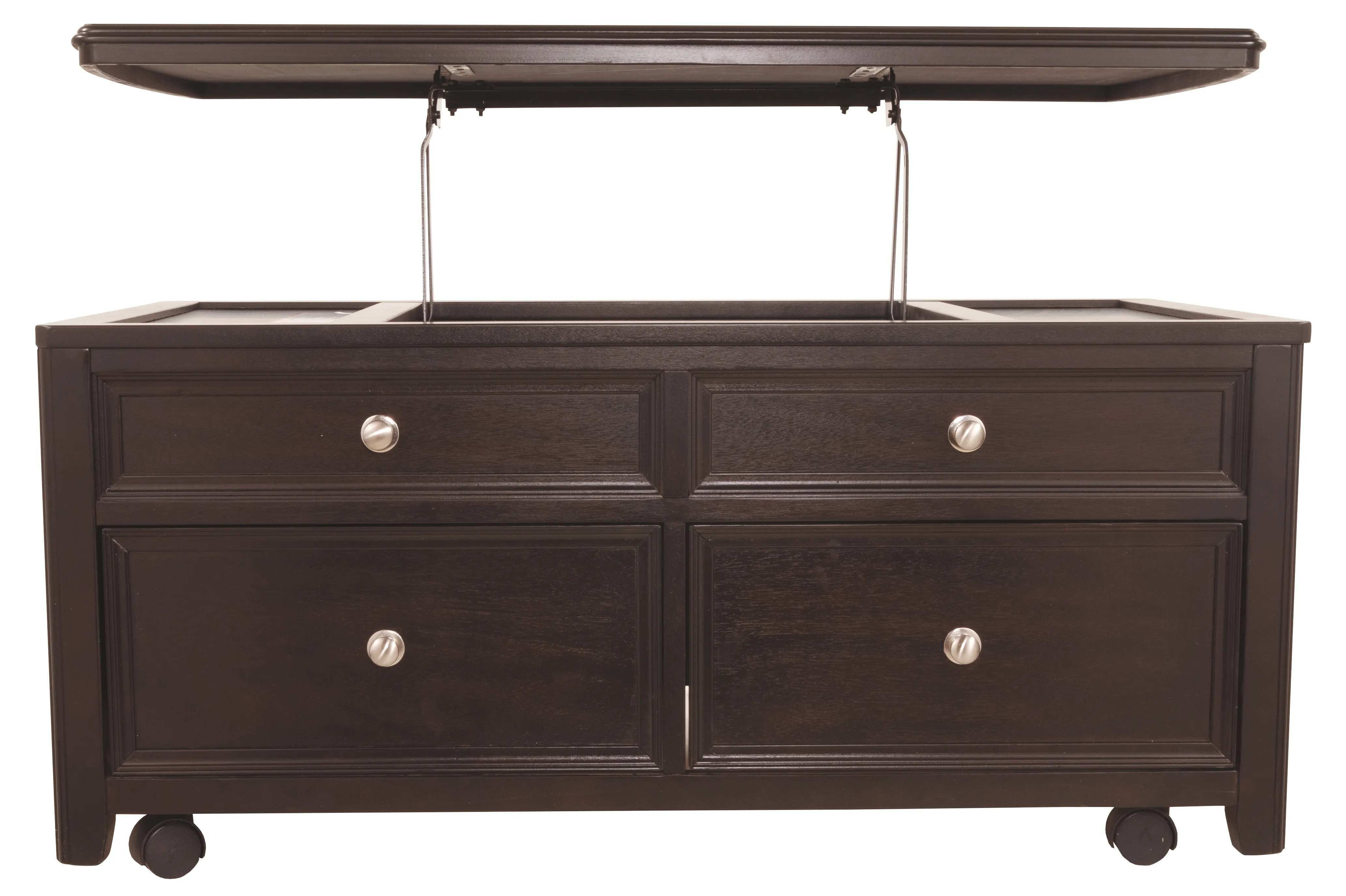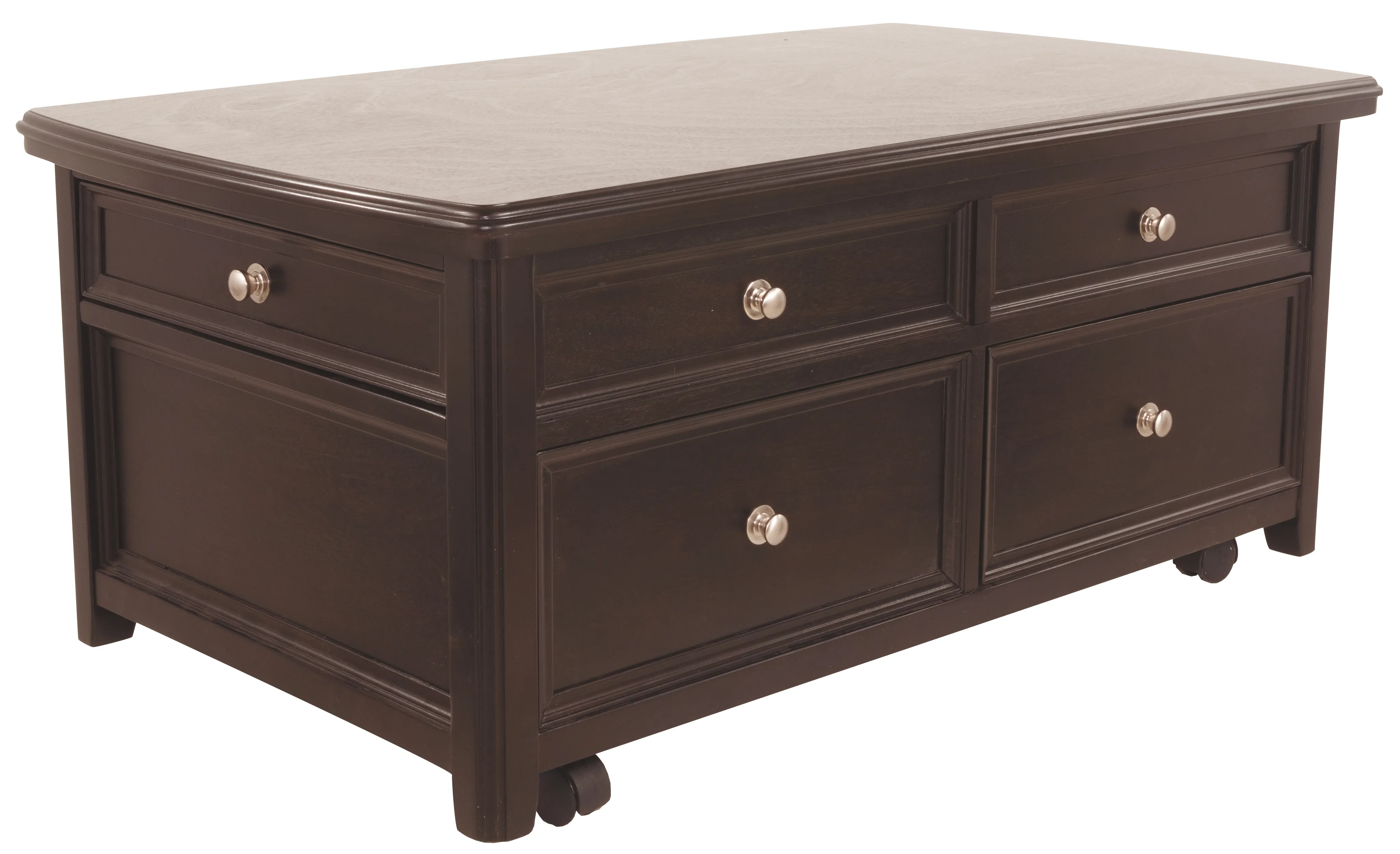 Offering everything from a spring-loaded rising tabletop and front and side drawers, to the option of casters-this lift-top coffee table is packed with pleasant surprises. Snappy nickel-tone hardware adds a clean, modern touch.