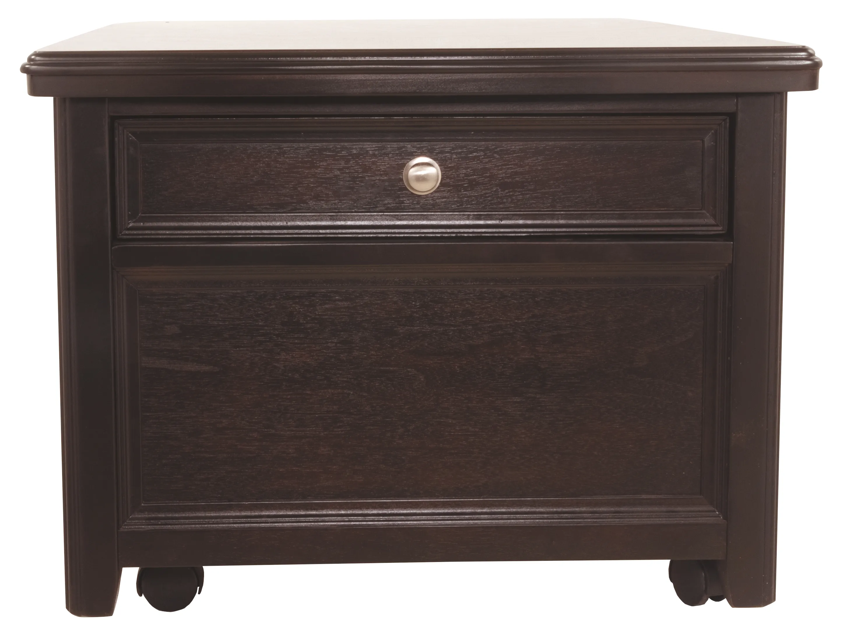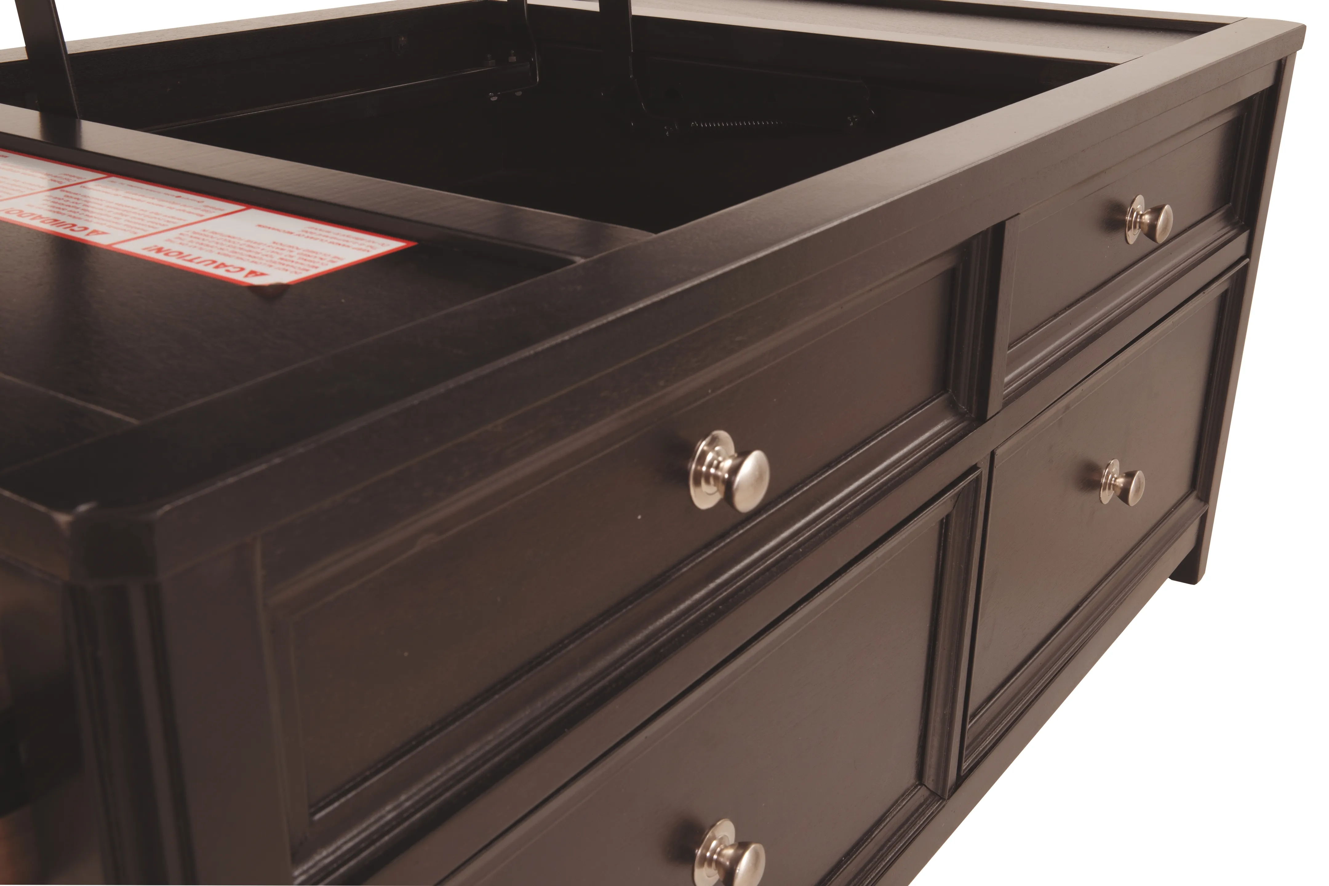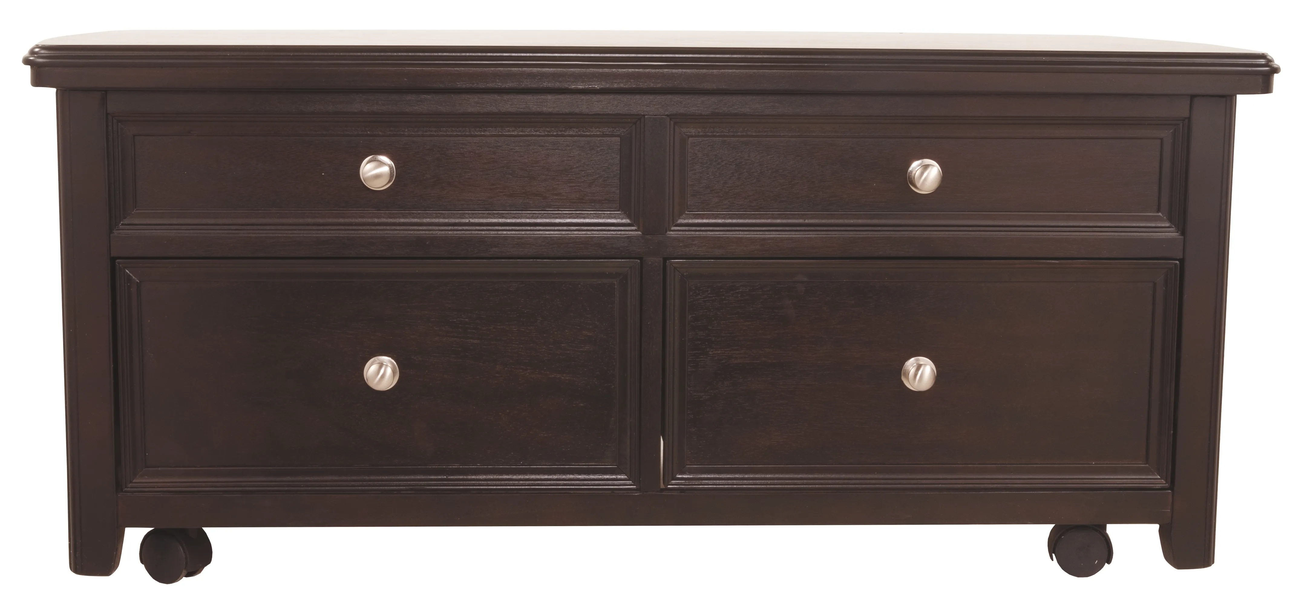 Offering everything from a spring-loaded rising tabletop and front and side drawers, to the option of casters-this lift-top coffee table is packed with pleasant surprises. Snappy nickel-tone hardware adds a clean, modern touch.