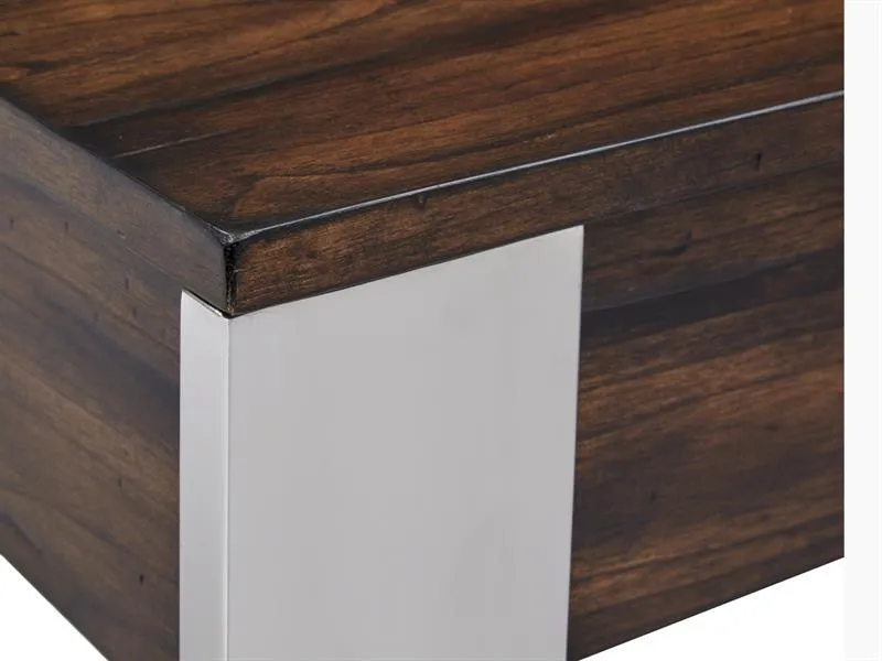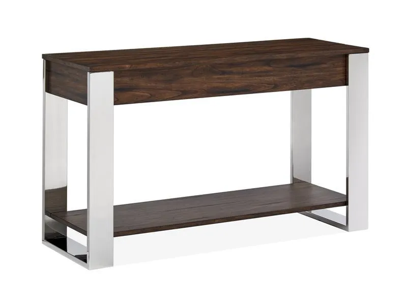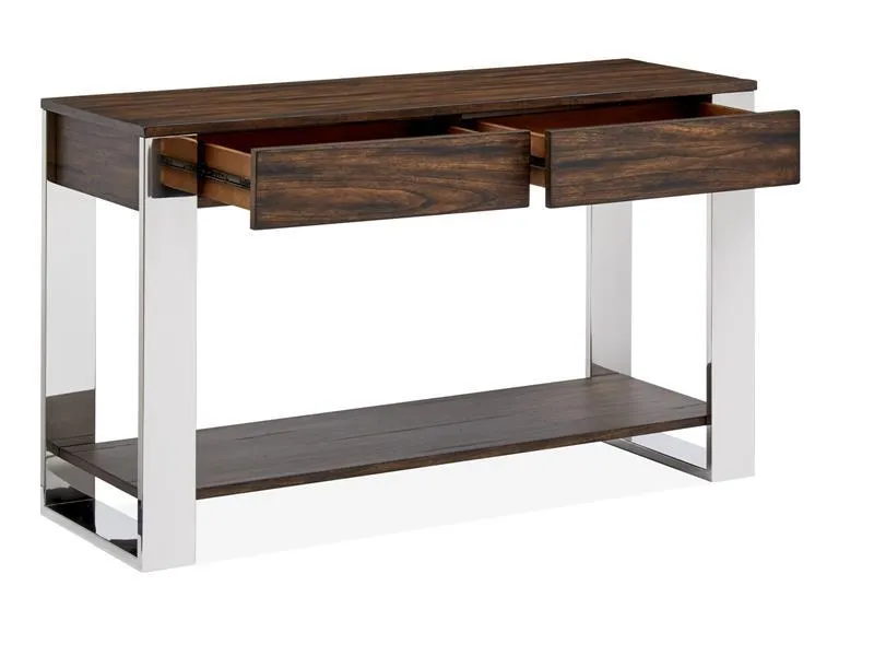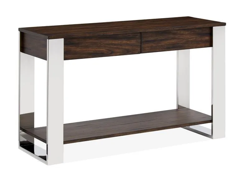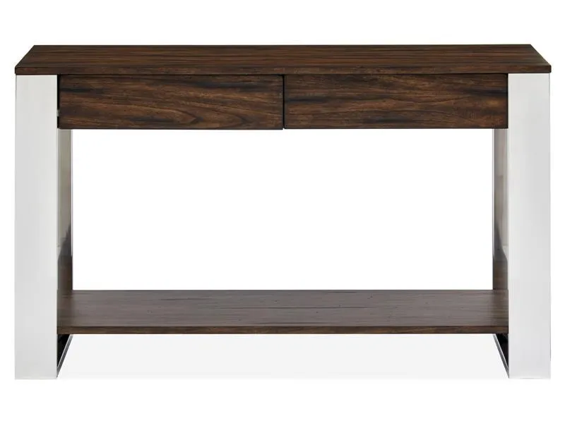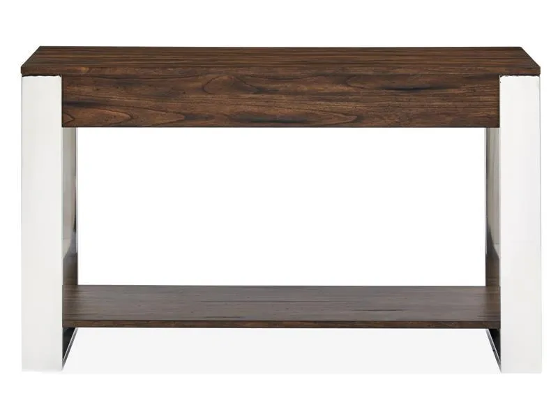 Enjoy the effortless pairing of the Chadwick Mocha finish and stainless-steel legs for an exceptional sophisticated appeal in the Duvall collection. The contemporary design is both functional and visually interesting. Finish: Chadwick mocha, Polished stainless steel.
