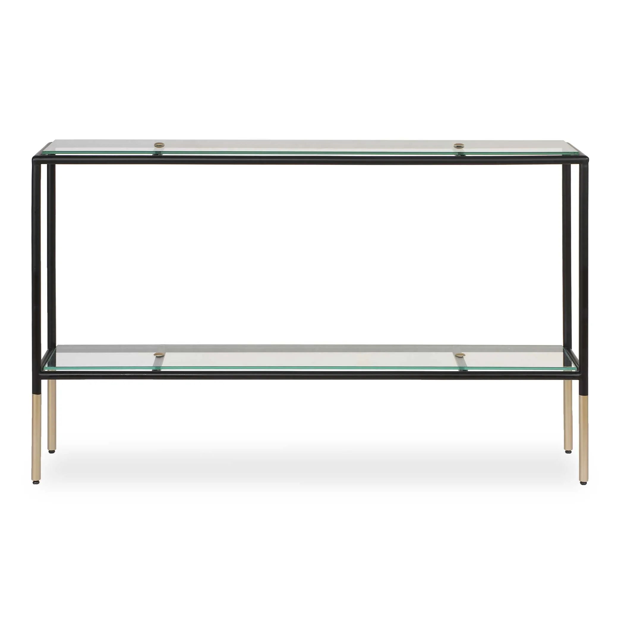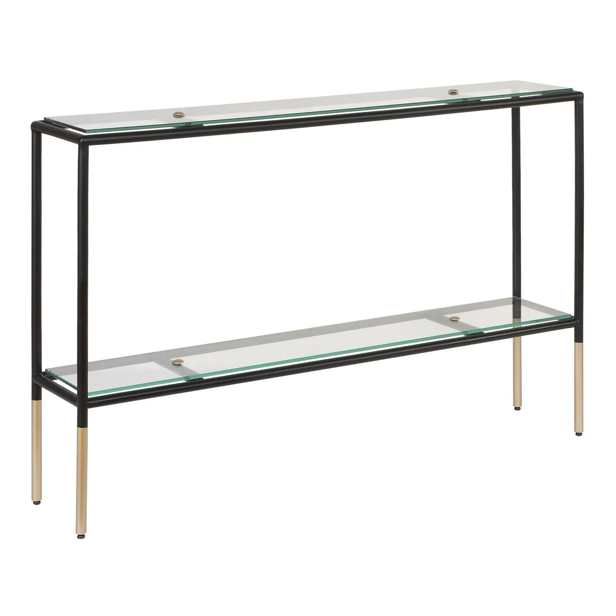 Finished in a sleek black with metallic gold accents, this metal console table features two spacious shelves, each made of tempered glass. The shelves are slightly elevated, appearing to be suspended in mid-air. Two decorative dome shaped metal buttons at
