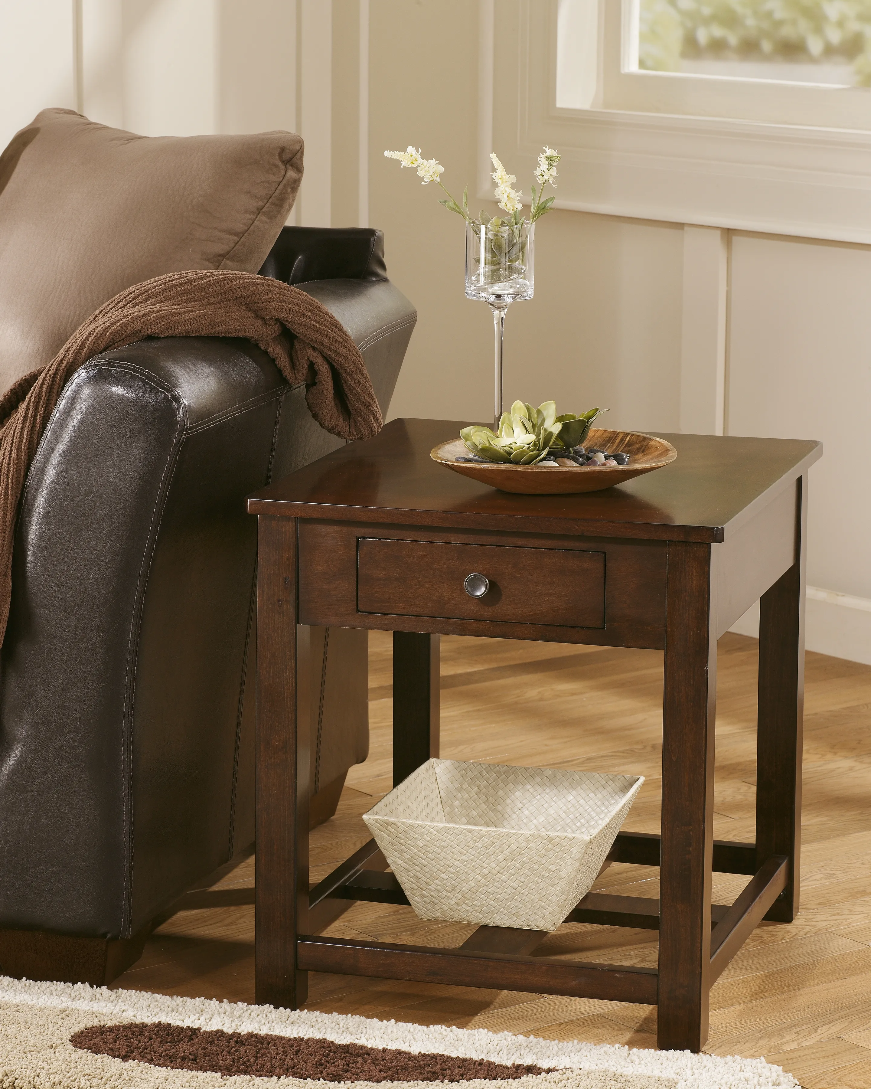 When done just right, simplicity can be simply striking-as is the case with this rectangular end table. Clean lines give it a great sense of ease, while a dark finish exudes rich character. A working drawer provides a handy hideaway place.