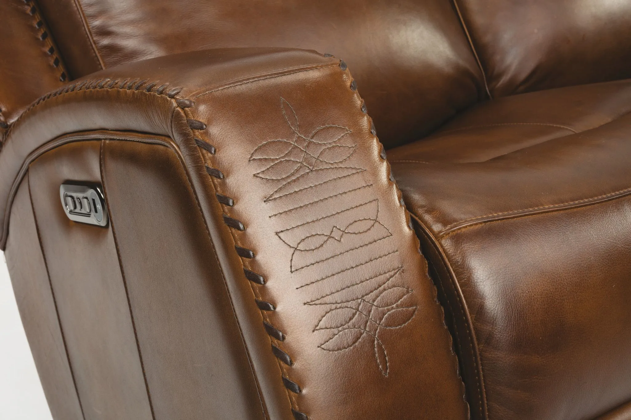 Find ultimate comfort with this statement piece. Inspired by cowboy boot designs, Mustang's intricately stitched arm design adds a unique, distinctive touch to this style. Large stitching in a contrasting leather throughout the piece adds yet another layer of texture and visual interest. Divided back cushions, subtle bucket seats, and fully padded footrests provide blissful sink-in comfort for long movie nights with friends and family.
