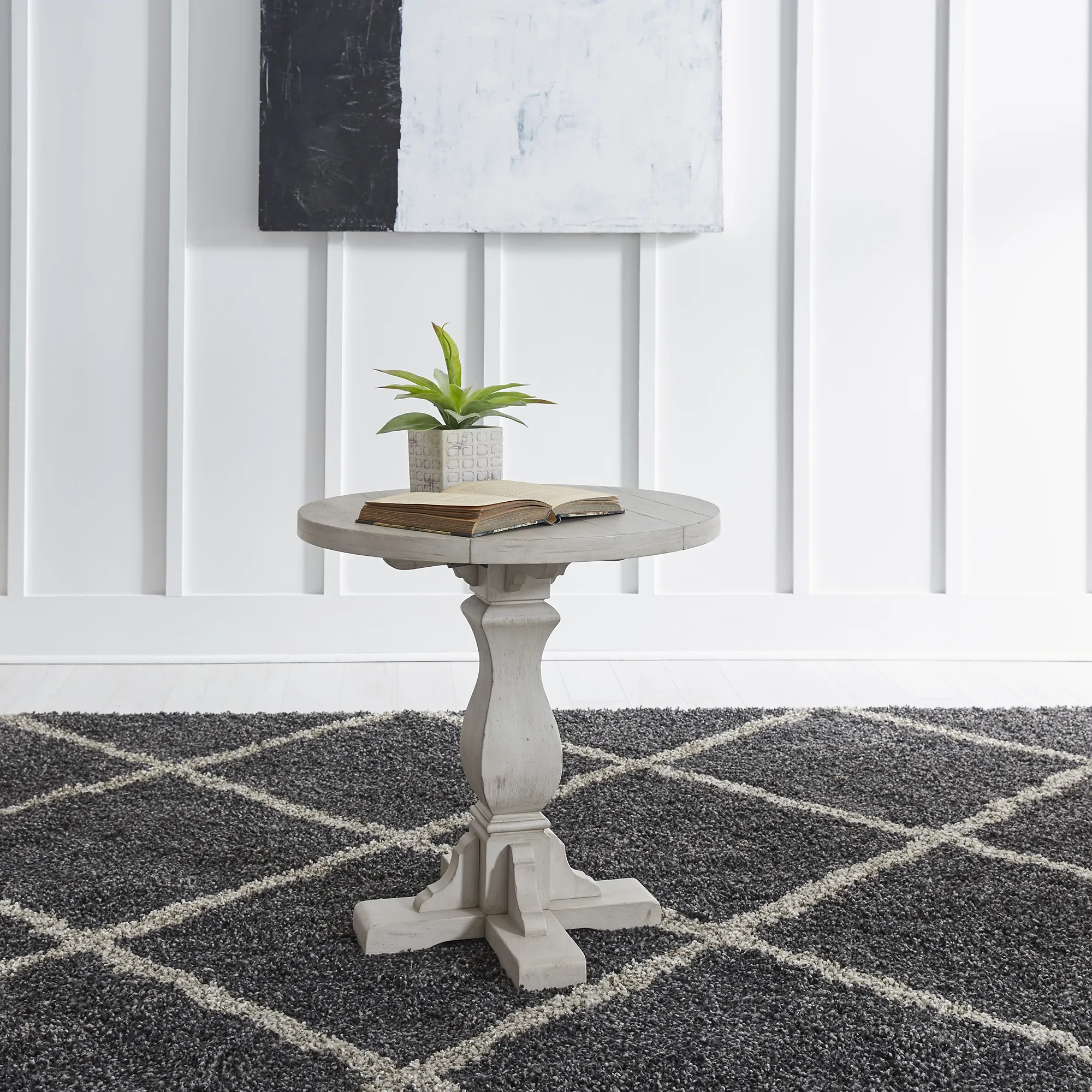 Home starts with the Harvest Home round cocktail table and two drop-leaf end tables. Crafted of rubberwood solids and knotty white oak veneers, this kit features a cottonfield white finish with saw cut hewing and thick butcher block planked tops with a solid wood edge. The round cocktail table features one full extension drawer with a wood framed drawer front, accented with antique pewter knob hardware. There is a bottom shelf for extra storage, anchored by square turned legs and casters for easy mobility. The drop leaf end tables have corbel accents and a square turned pedestal flowing into an X-base at the bottom. These end tables are unique with the ability to drop both ends of the top to save space. Harvest Home offers a rich palette of finishes and textures inviting one to relax in the comfort of a retreat: Your Home!