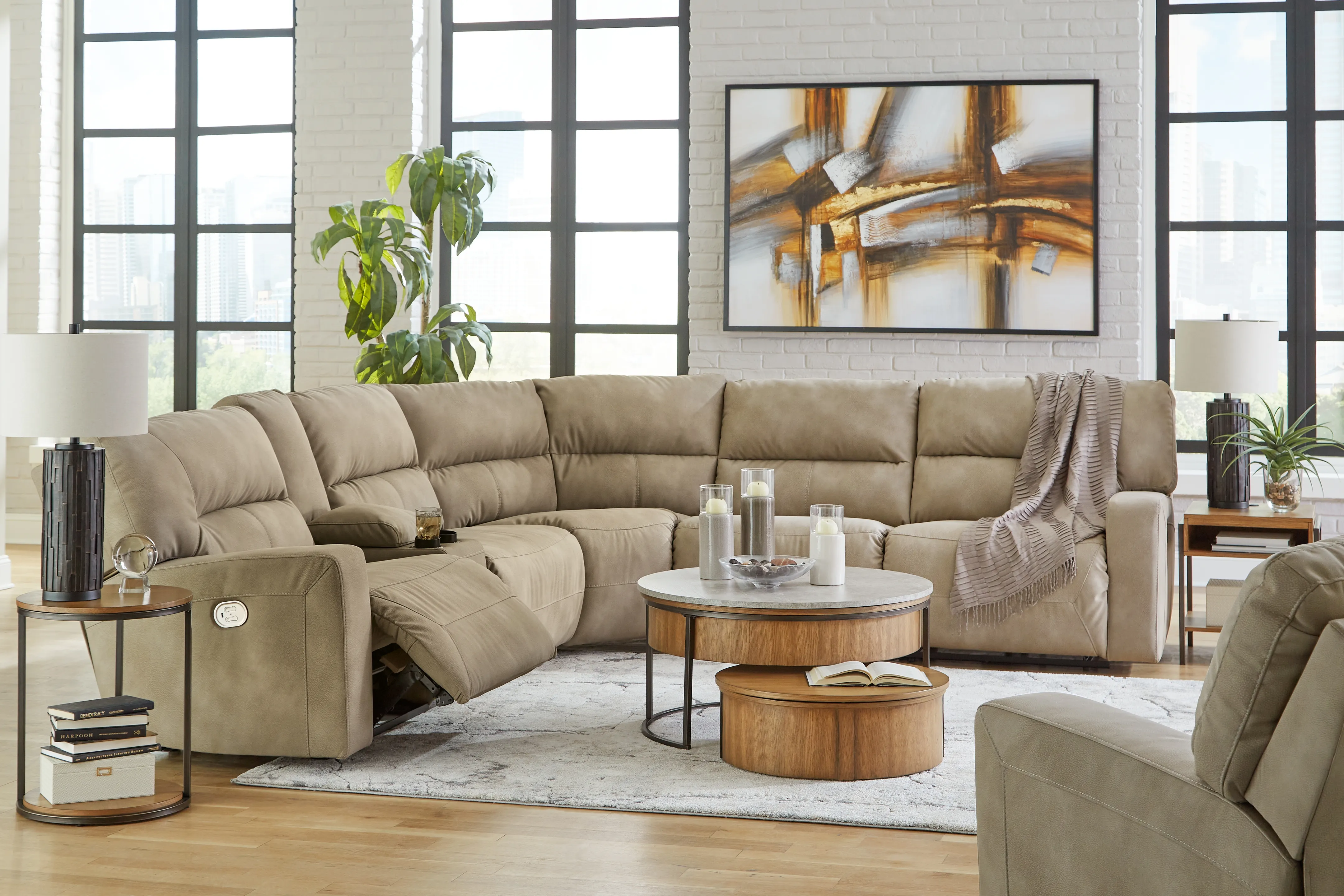 If you’re looking for a brilliant blend of comfort, quality and flair, this faux leather power sectional excites and delights with sleek, modern style—priced to put you at ease. Appealing to those with an eye for contemporary design and high-tech features, this sand colored sectional offers adjustable headrests, zero-draw USB charging and a zero-gravity ottoman for improved circulation. Distinctive elements include flared, sheltering armrests and subtly tufted seat cushions that add a high-design touch.
