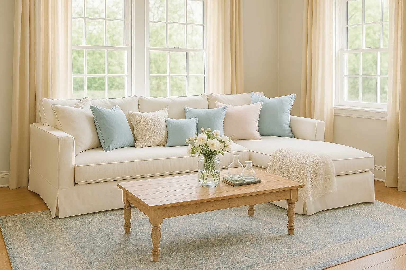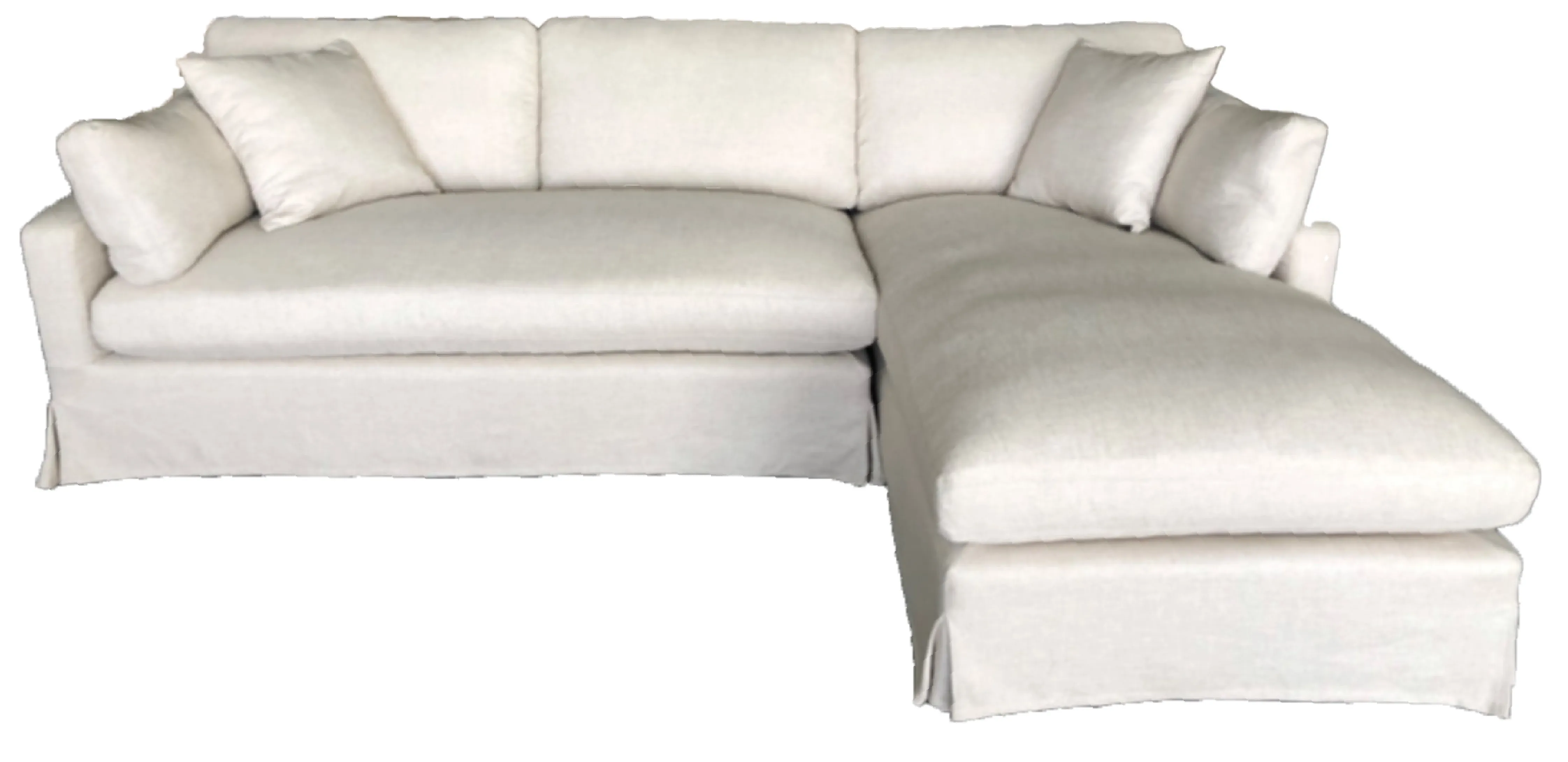 This beautiful white sofa with a chaise is the perfect addition to any living room. Featuring a spacious chaise on one end, you can comfortably stretch out your legs and relax after a long day. The sofa is adorned with four white throw pillows, giving it an extra touch of comfort and style. The skirt at the bottom adds a homey feel, making it a cozy and inviting place to sit. Whether you're entertaining guests or just curling up with a good book, this sofa with a chaise is sure to become your new favorite spot in the house.