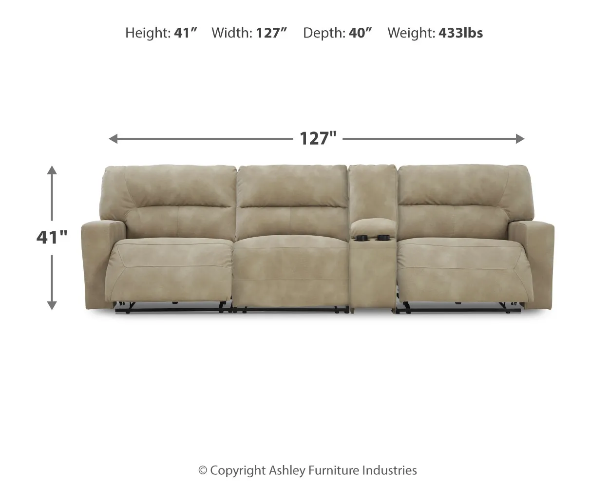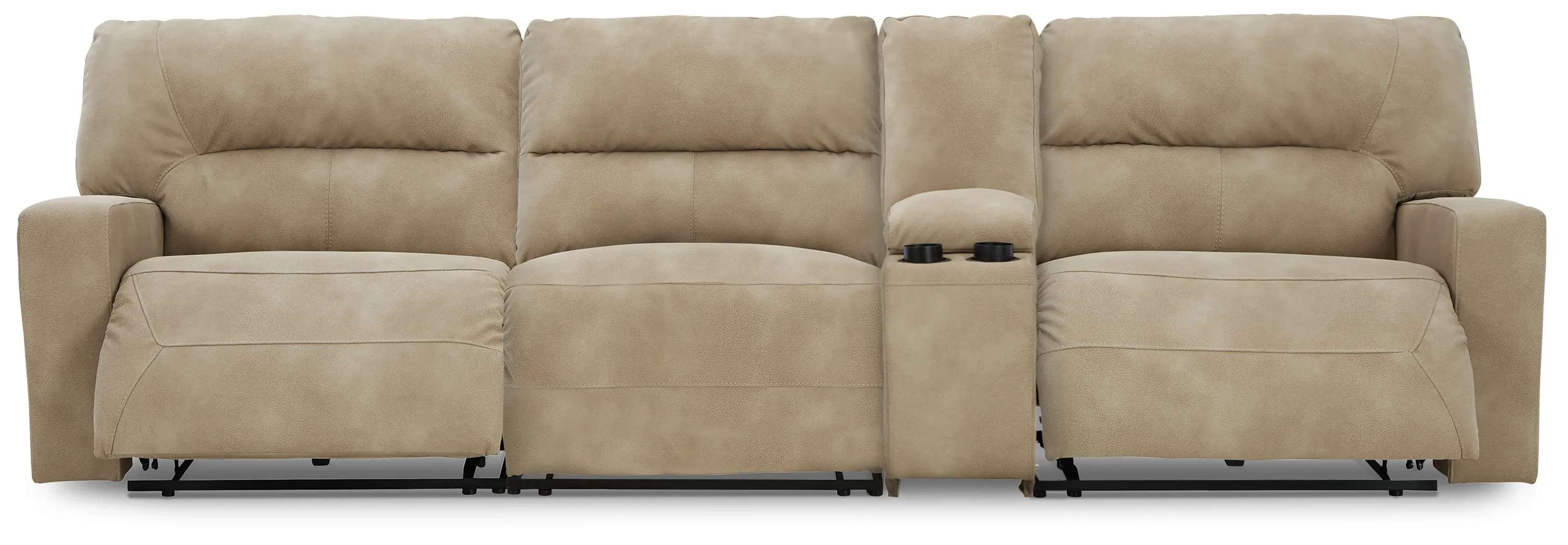 Includes 4 pieces: left-arm facing power recliner, right-arm facing power recliner, power armless recliner and console with storage