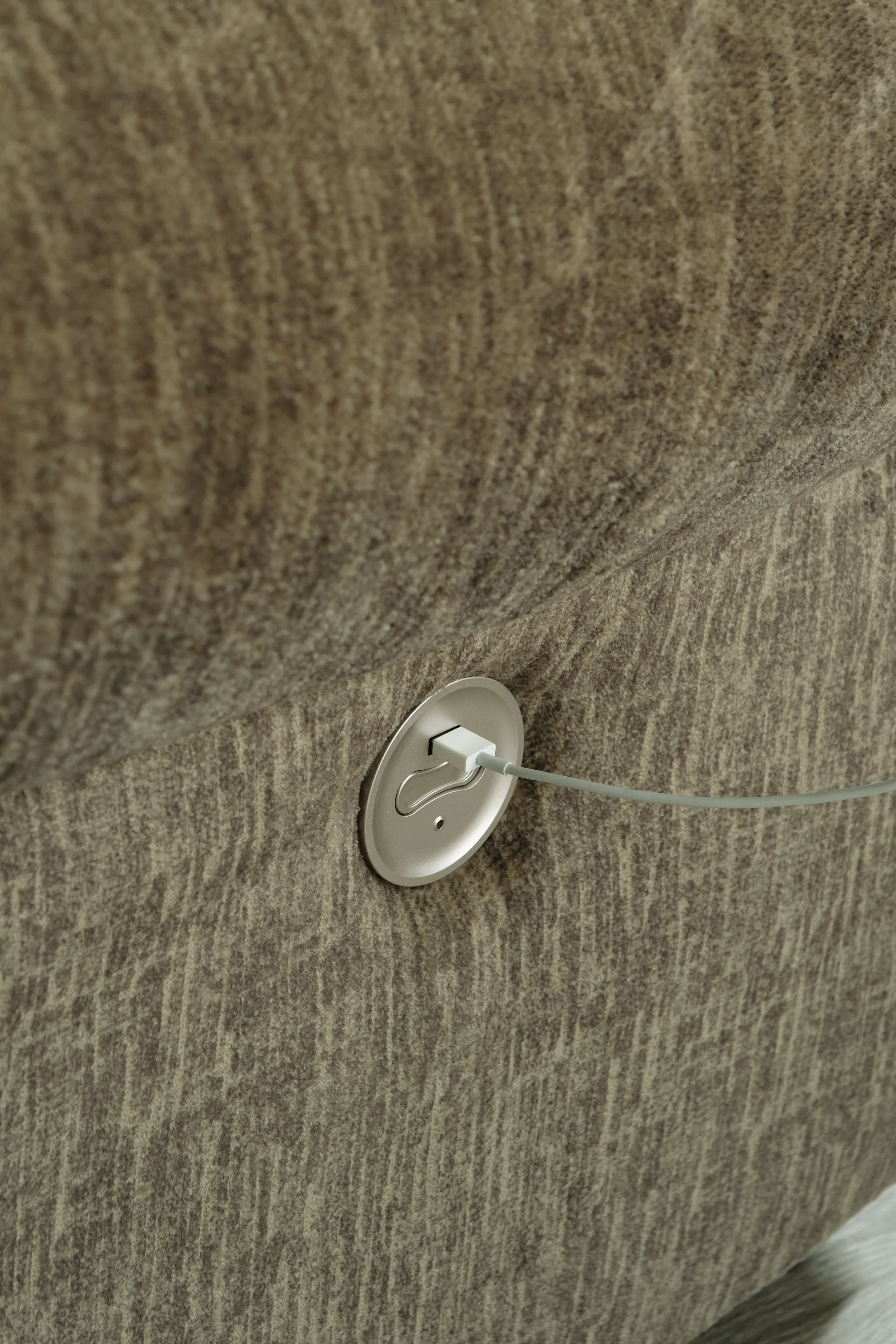 Dressed to impress. Made to caress. With this sectional with power, you get the best of both worlds: the cool look of leather and the warm, cozy feel of fabric. Sporting a transitional look that suits contemporary and classic interiors, the high-style sectional is wrapped in an espresso brown faux leather enriched with divided back cushioning, jumbo stitching and roll armrests for fashionable flair.
