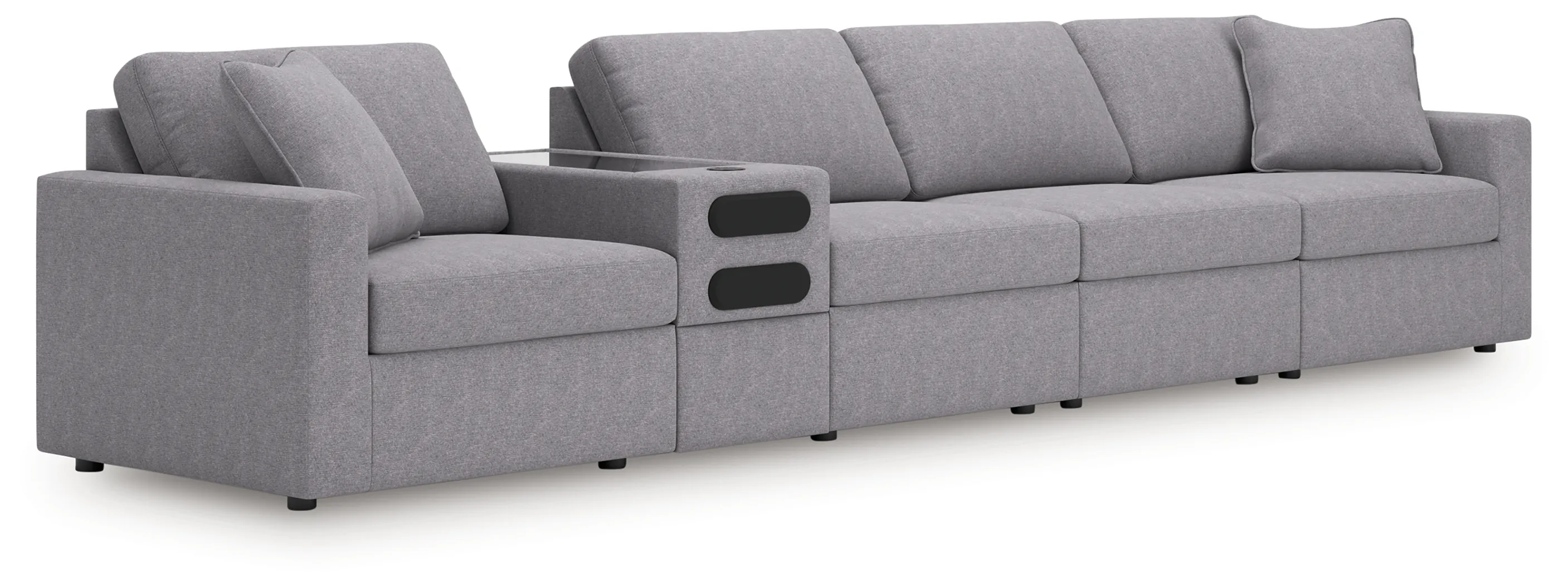 Includes 5 modular pieces: left-arm facing corner chair, audio console with storage, 2 armless chairs and right-arm facing corner chair