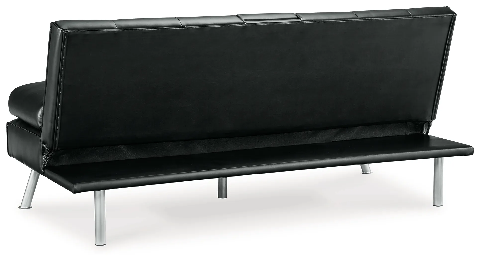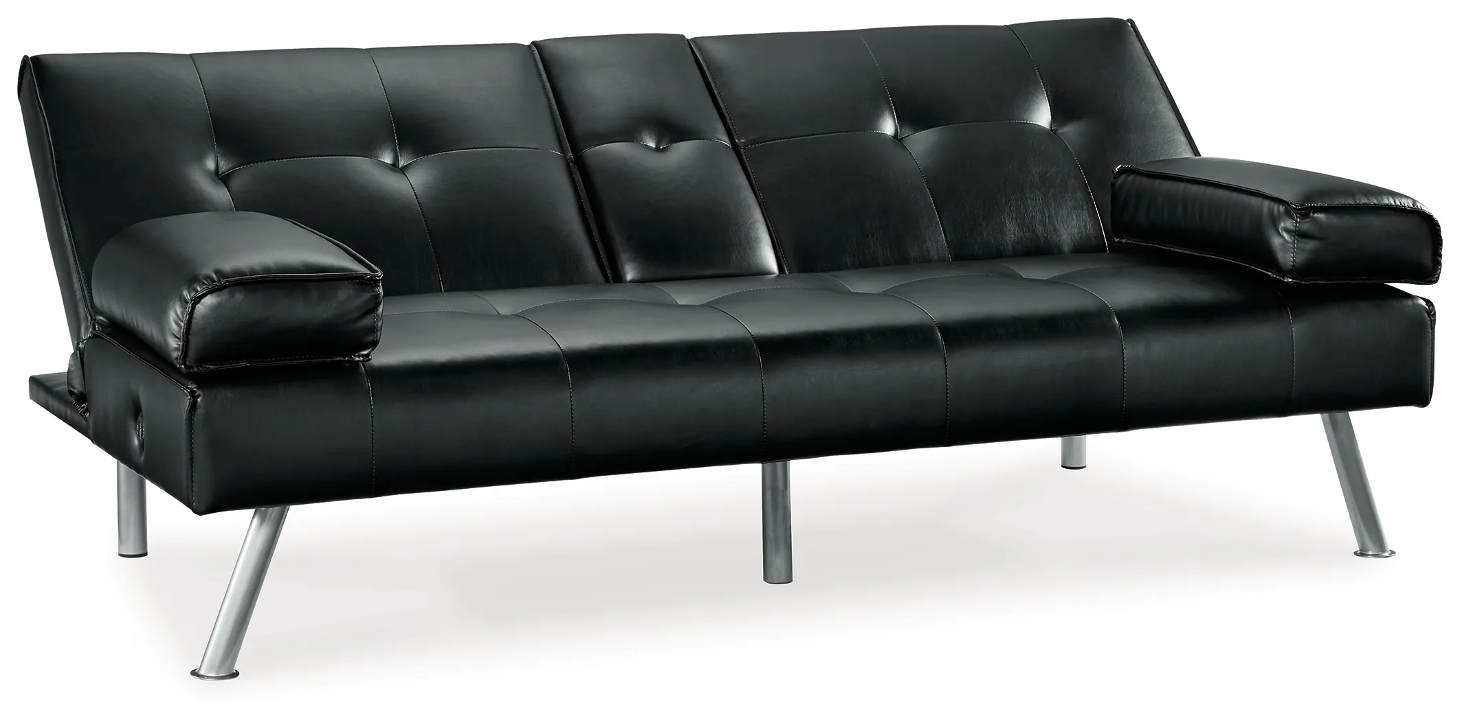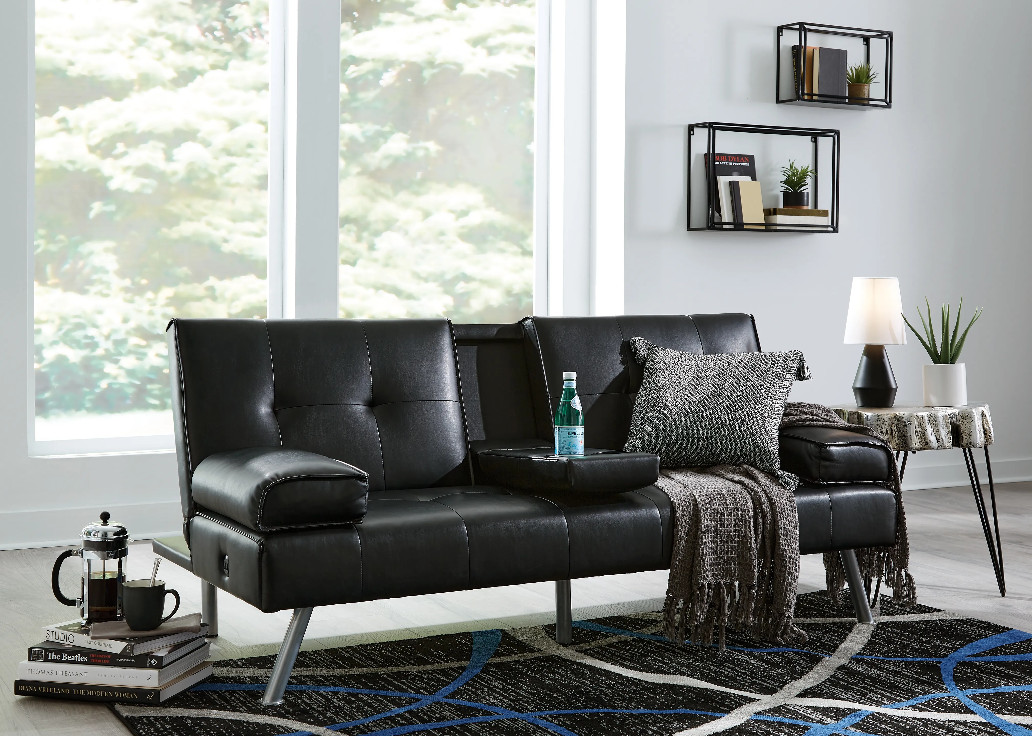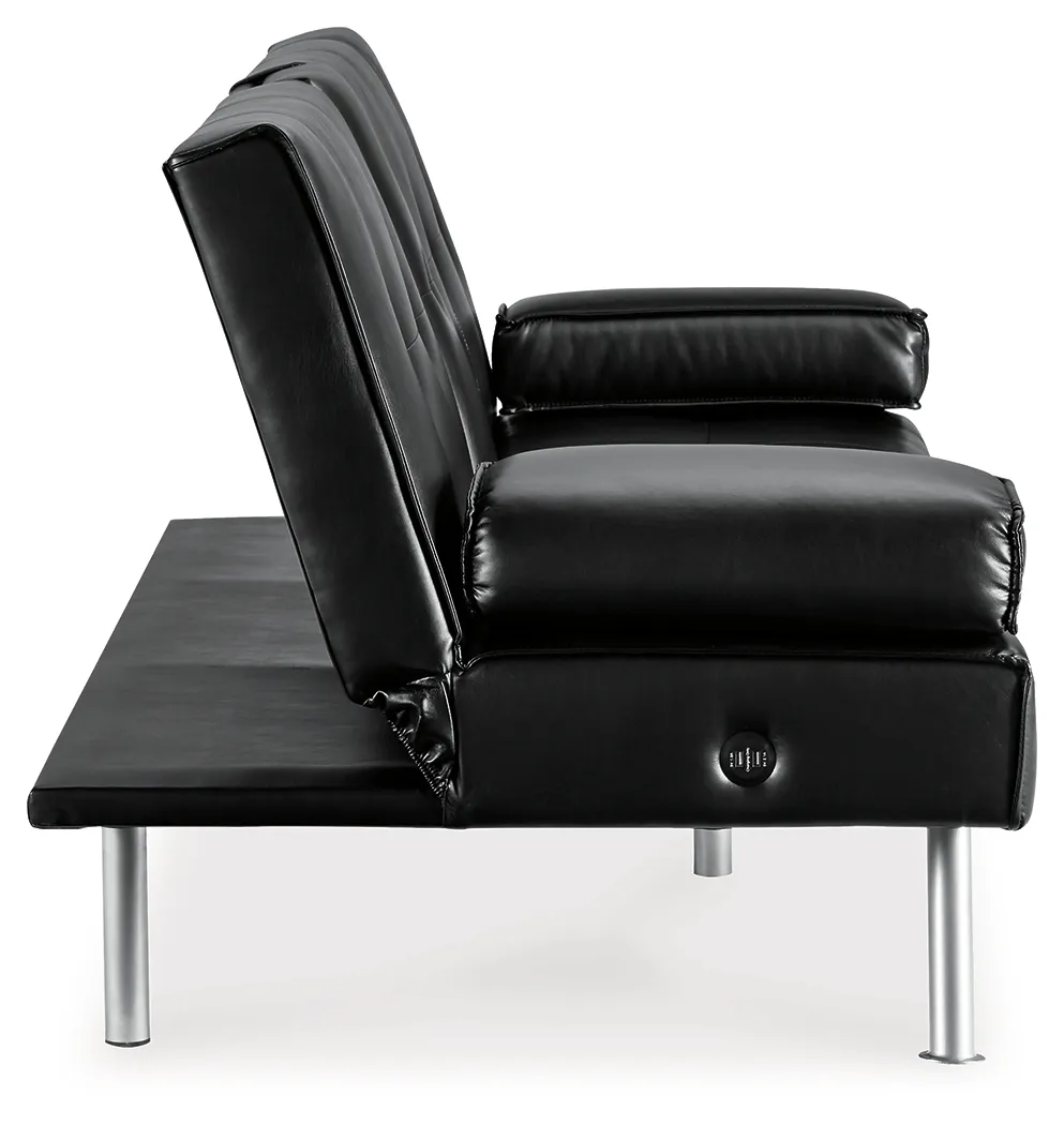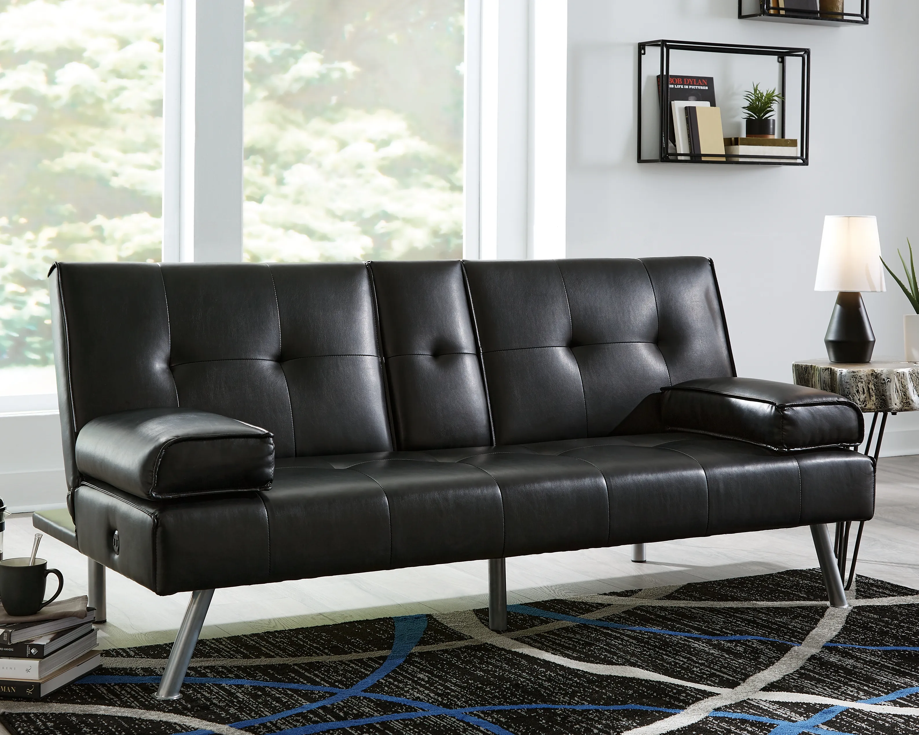 When space is limited, make smart use of your living area. This flip flop sofa maximizes space by combining a sofa and bed into one streamlined piece with a sophisticated-yet-simple design. The back cushion flattens to convert it into a comfortable futon. The sofa features a drop-down console with dual cupholders, USB charging ports and cushioned armrests that double as pillows. A straightforward, sleek design and splayed metal legs provide a mid-century modern feel. The sofa's piece de resistance: black faux leather, which dresses it up while adding longevity and durability.