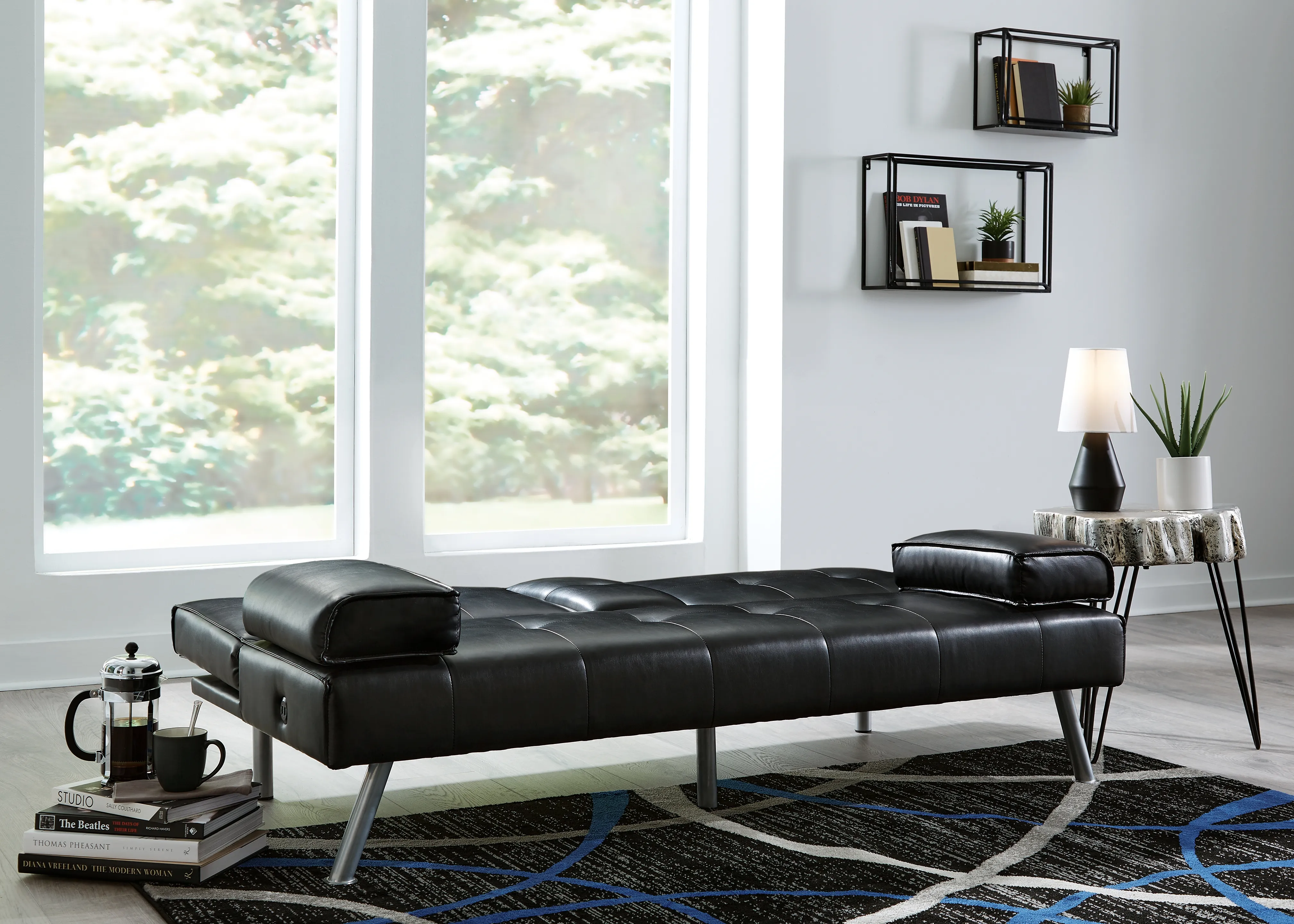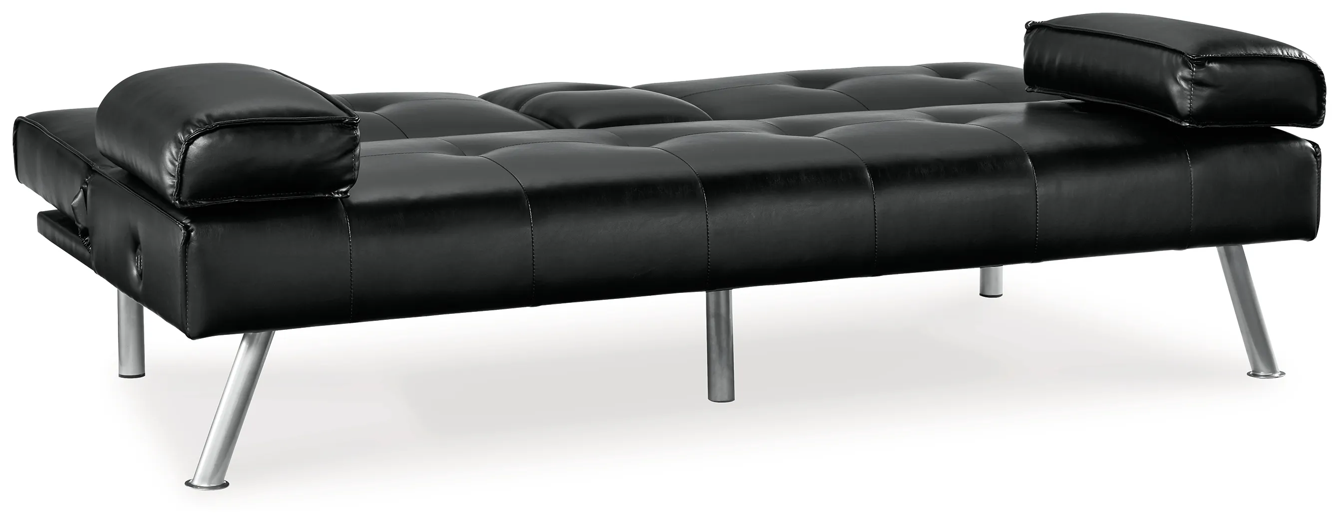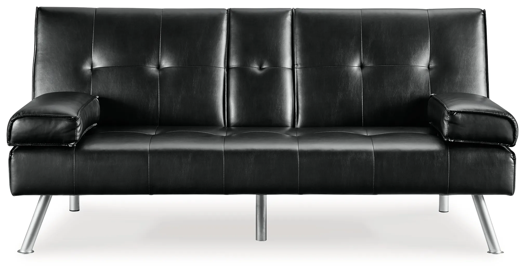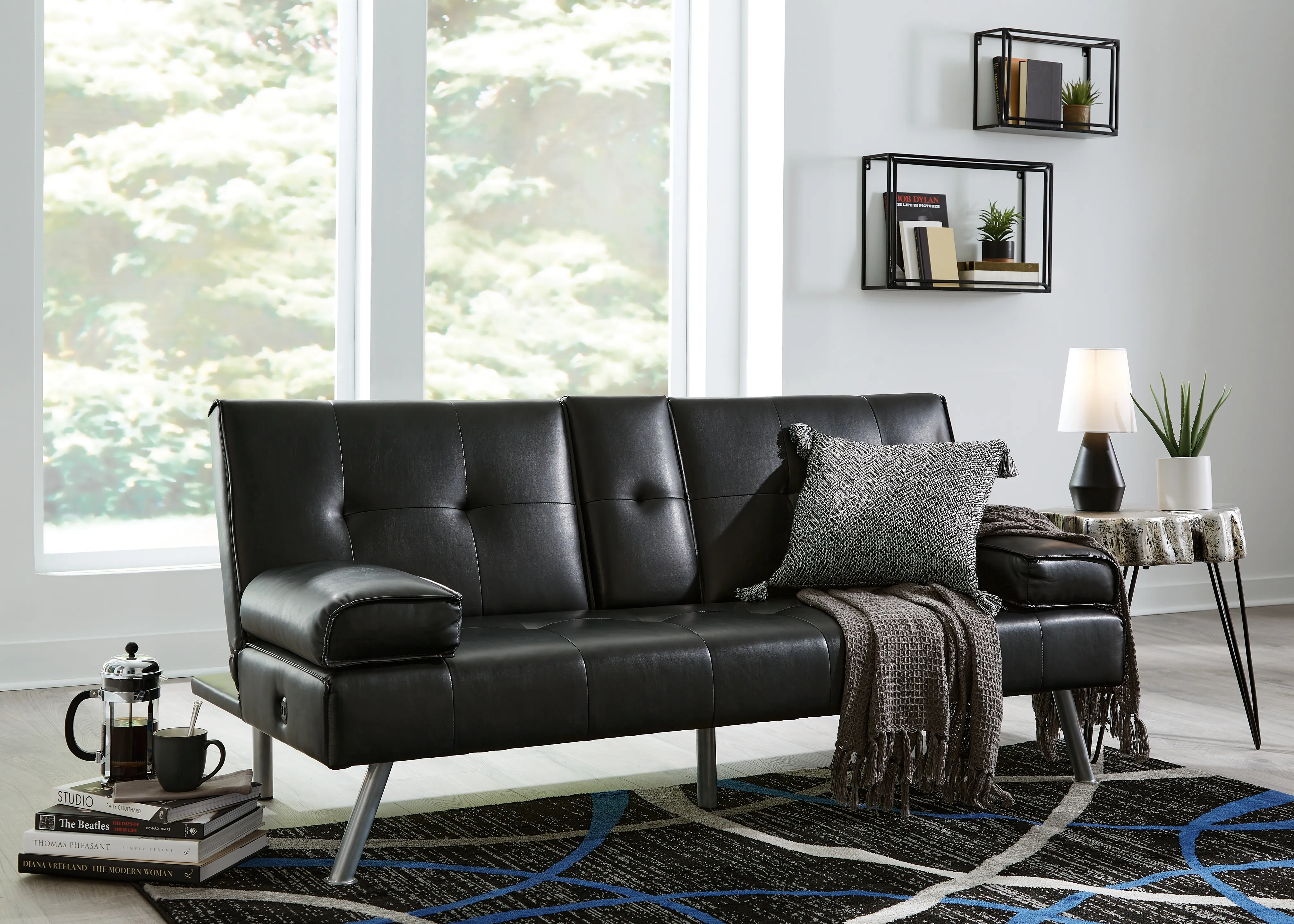 When space is limited, make smart use of your living area. This flip flop sofa maximizes space by combining a sofa and bed into one streamlined piece with a sophisticated-yet-simple design. The back cushion flattens to convert it into a comfortable futon. The sofa features a drop-down console with dual cupholders, USB charging ports and cushioned armrests that double as pillows. A straightforward, sleek design and splayed metal legs provide a mid-century modern feel. The sofa's piece de resistance: black faux leather, which dresses it up while adding longevity and durability.