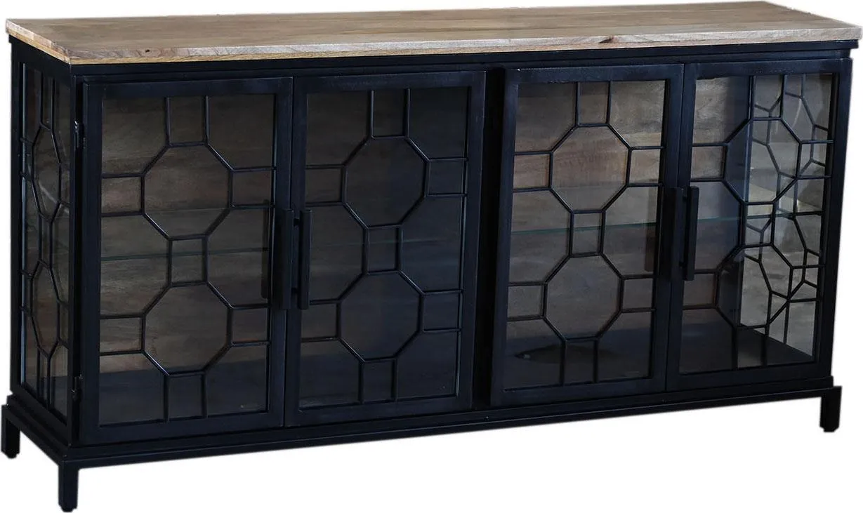 The Mariani cabinets are constructed, using MIG welding joint methods, of iron in a black powder coated finish. Inside backs of mango in a natural finish, decorative iron grills over "Tuffen" glass, shelves of the same glass and large bar style pulls complete the silhouettes. Additionally, this Cabinet boasts a top surface of mango with a water resistant lacquer seal.