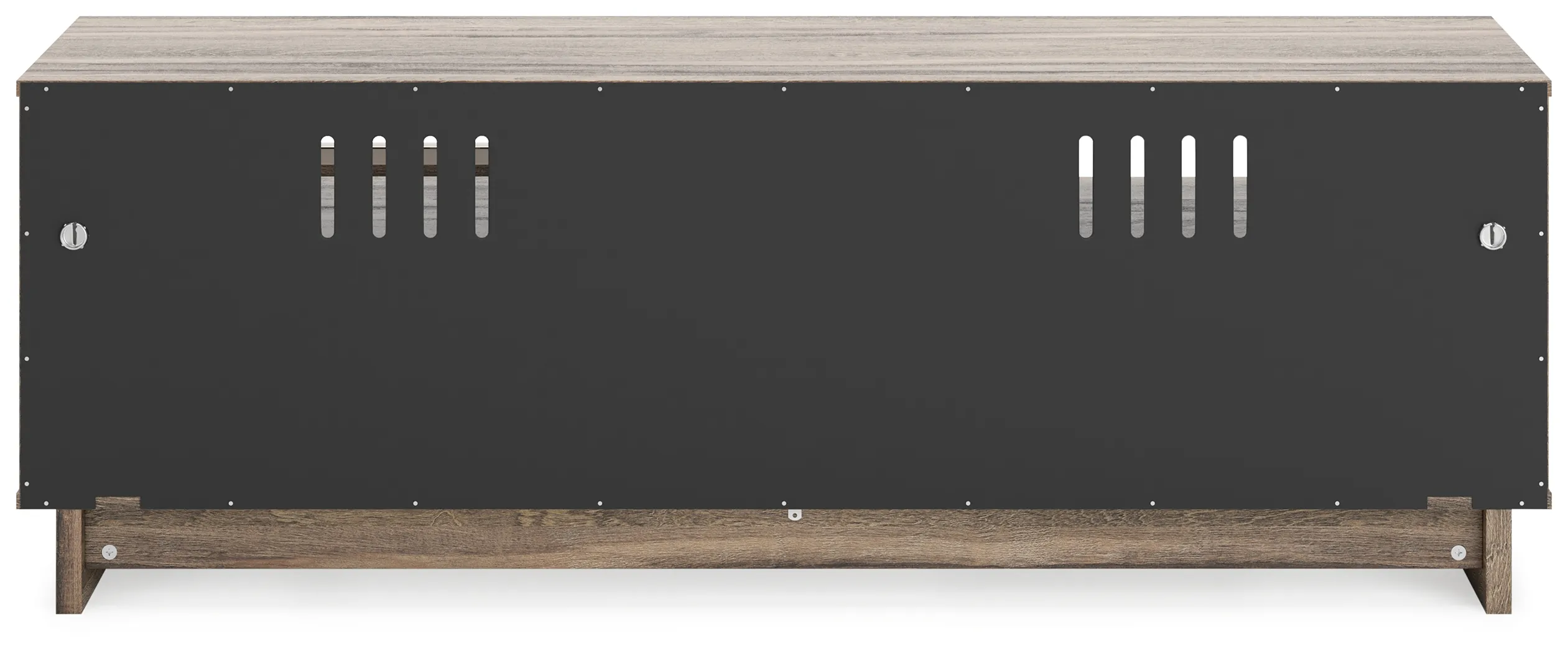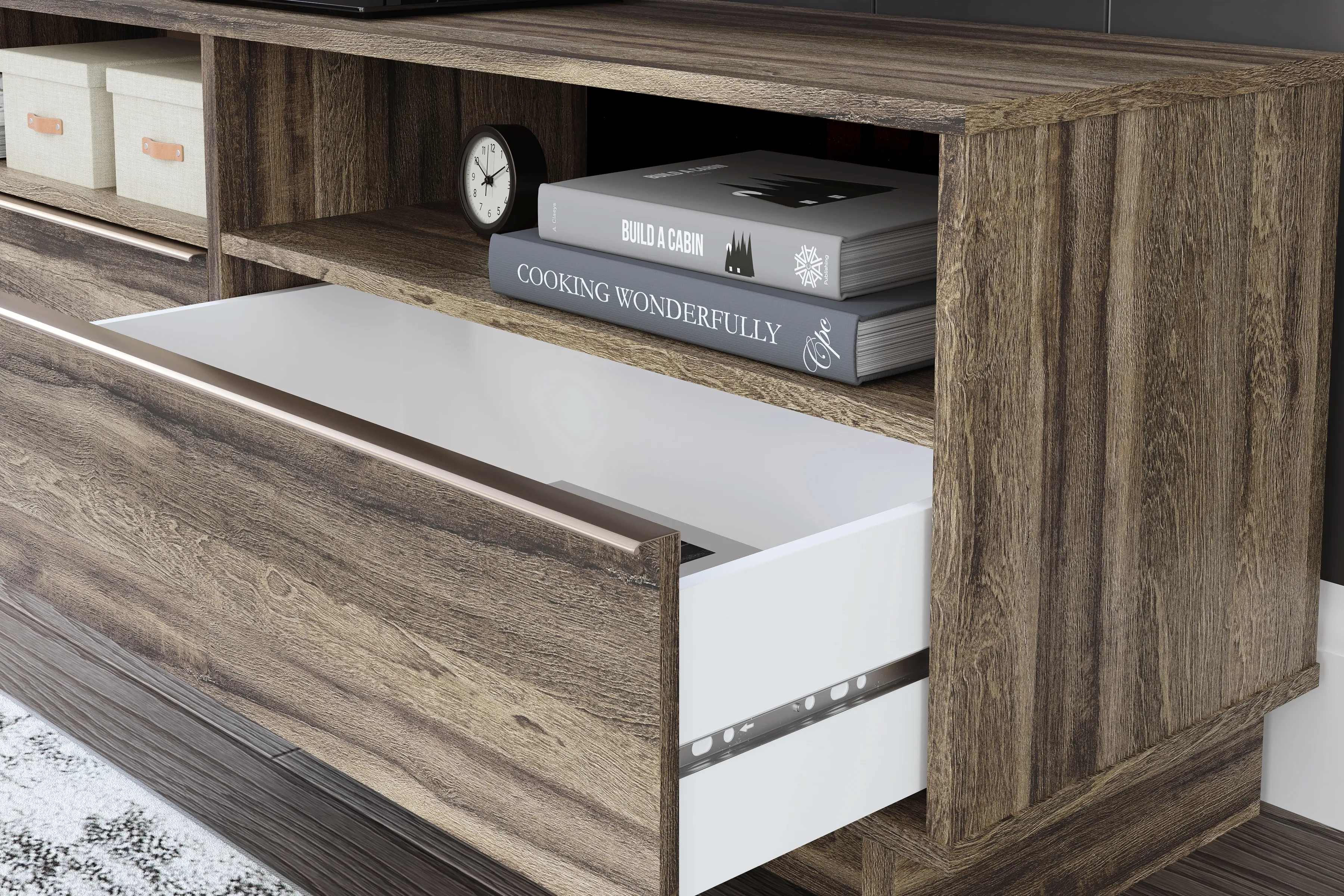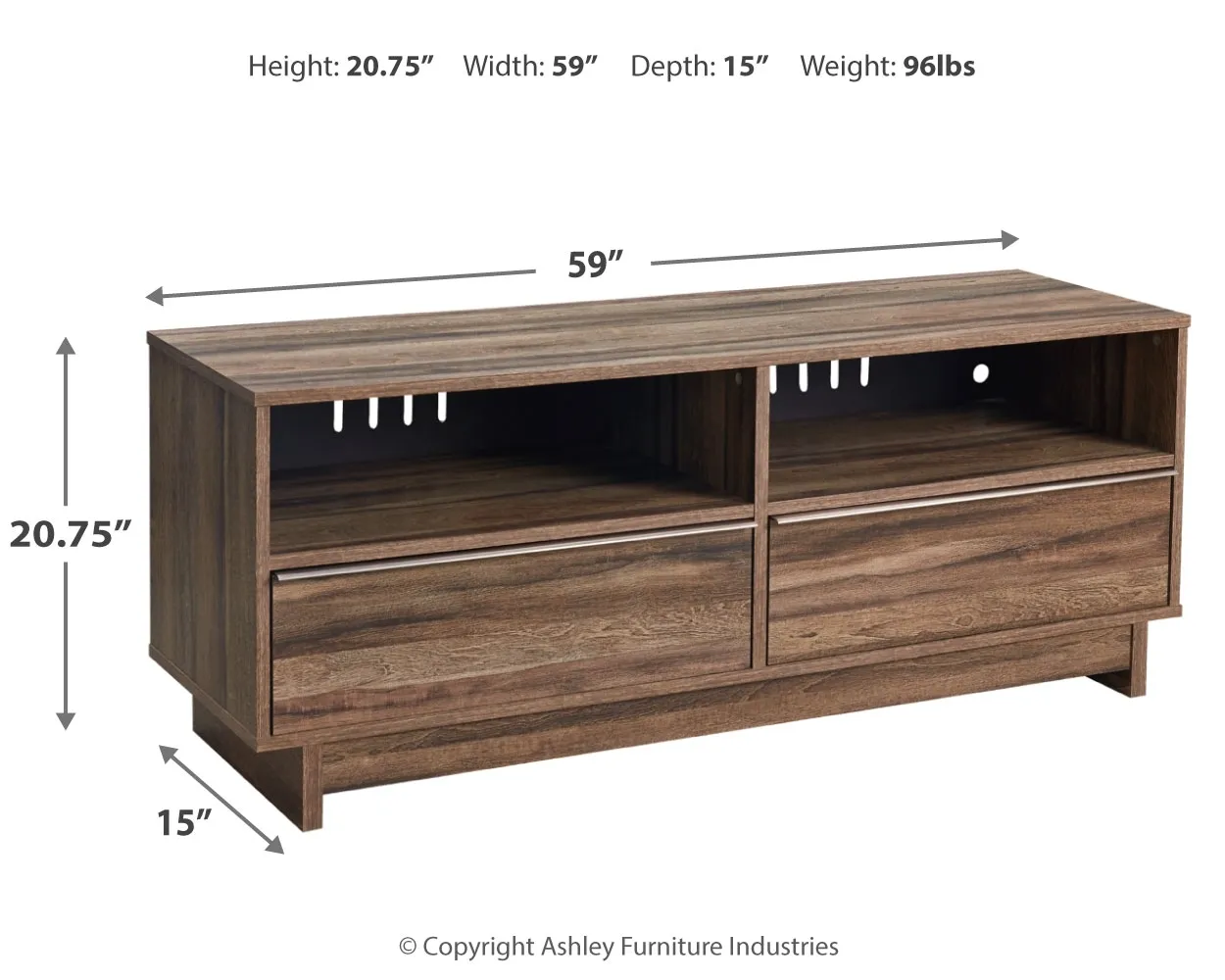 Your modern sanctuary is within reach. The subtle design of this TV stand features two open cubbies for streamlined storage. Its weathered brown finish is accented with refined champagne-colored handles on the two smooth-gliding drawers.