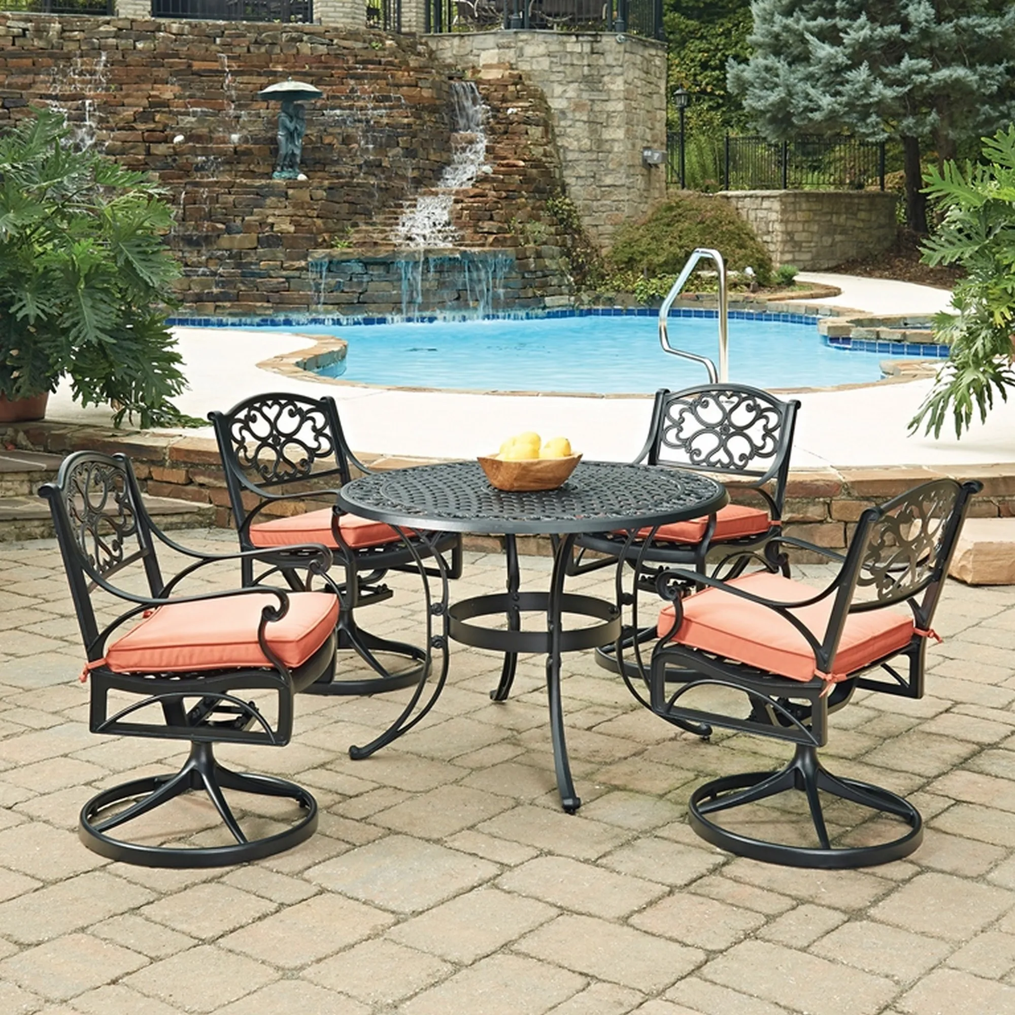 This Sanibel 5-piece dining set includes a round table and four swivel chairs with cushions, all made of cast aluminum with a powder-coated finish and a clear coat that offers total protection from the elements. The design allows water to quickly drain through to prevent pooling or staining.