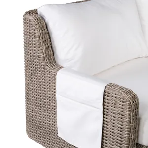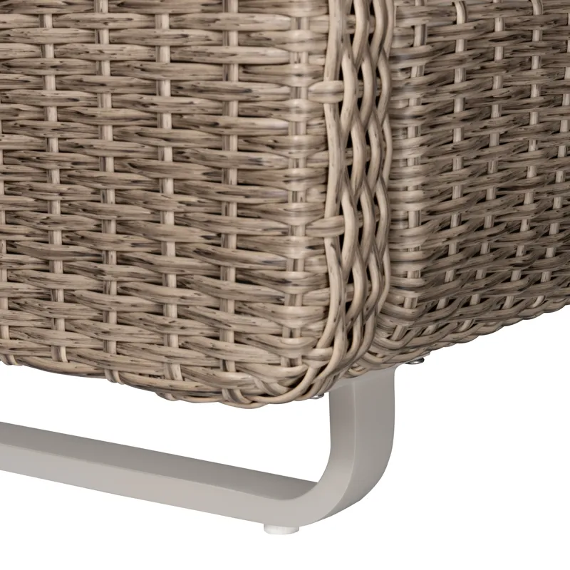 Warm gray synthetic wicker is infused with UV inhibitors that prevent fading