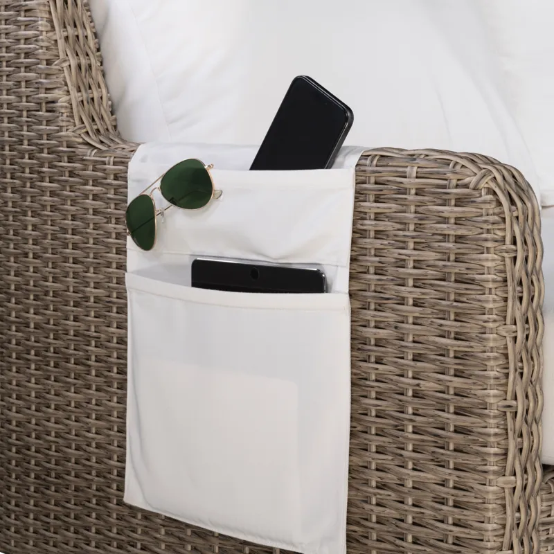 Includes a matching fabric pouch on each arm for storing phones, sunglasses, books and more